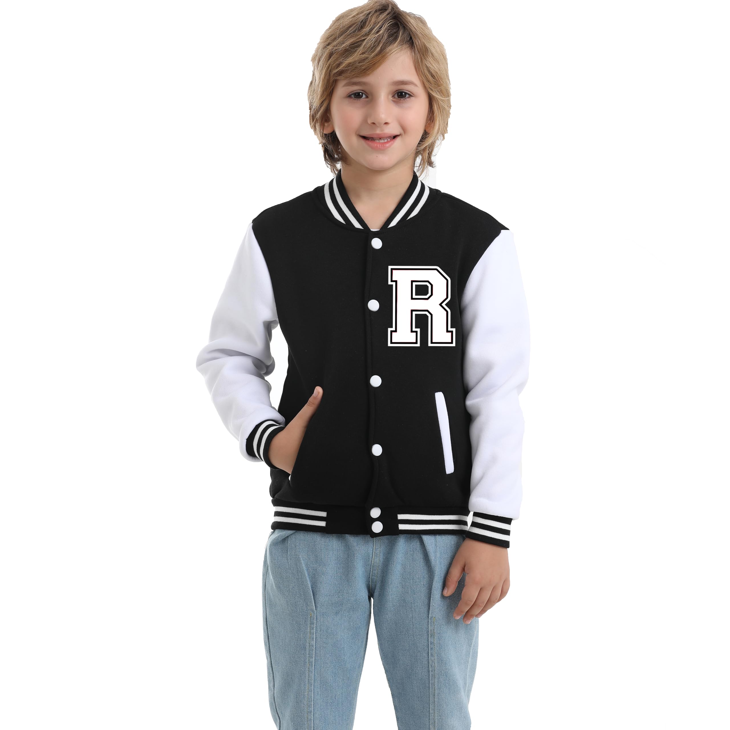 Stylish Baseball Jacket: This kids' varsity coat features a trendy letter print design, perfect for both boys and girls.Lightweight and Comfortable: Made from high-quality materials, soft and warm,our casual jacket is lightweight and ensures all-day comfort.Versatile School Uniform: A must-have addition to your little one's school wardrobe, this jacket adds a stylish touch to any uniform. It's Suit for School, Daily Wear,Travelling,Camp, Sports, Casual Wearing, Outdoor Activities.Secure Button Closure: Designed with buttons for easy on and off, this jacket provides a secure fit for active kids.Durable and Long-lasting: Built to withstand daily wear and tear, our jacket is made to last, ensuring long-lasting use.