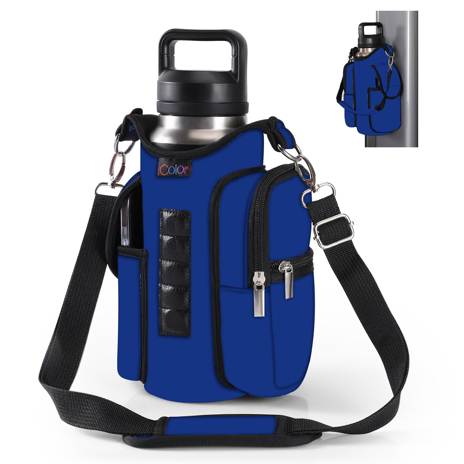 icolor Gym Magnetic Bag Water Bottle Carrier Holder with Phone Pockets & Gym Accessories Organizer for Men Women,5 Built-in Magnets Gym Bottle Sling Bag Pouch Sleeve with Handle Shoulder Strap (Blue)