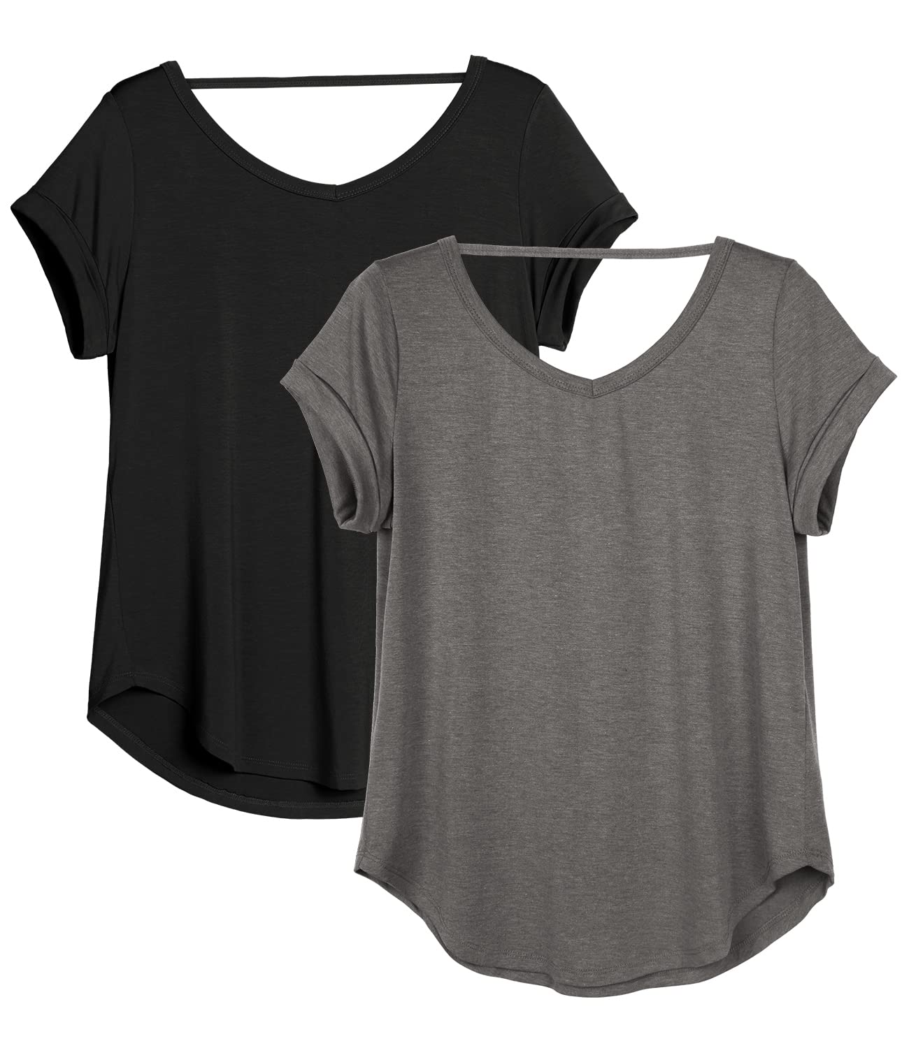 icyzone Open Back Yoga Shirts for Women - Exercise Workout Tops, Athletic Short Sleeves, Running T-Shirts Loose Fit (Black/Charcoal, M)