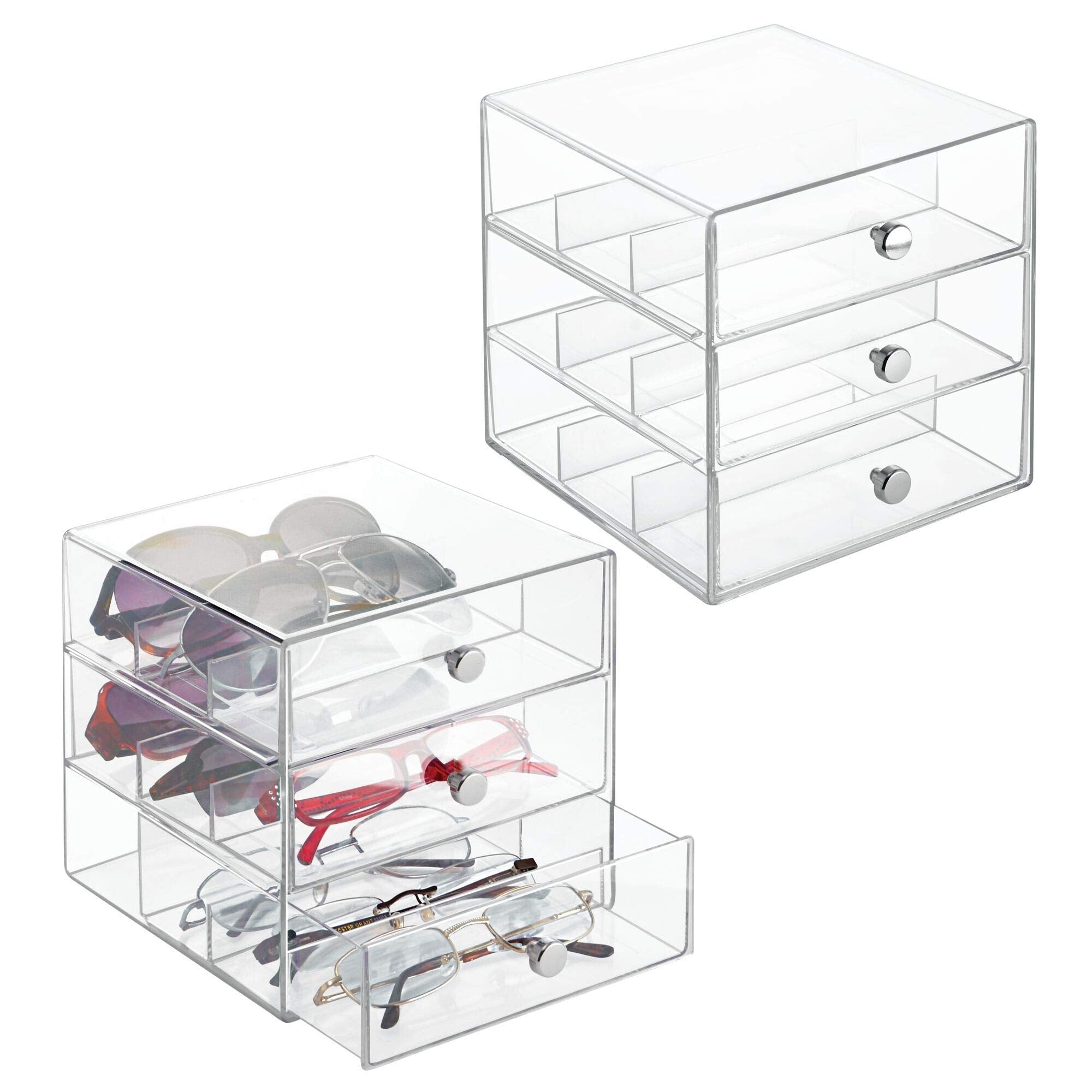 iDesign's Clarity 3-Drawer Stackable Glasses Organizer is the perfect addition to your vanity. This organizer is perfect for storing your sunglasses, eyeglasses, or reading glasses. With 3 transparent drawers, you won't have to spend time digging to find what you're look for - you can easily see what you need, grab it, and go! Each drawer has 3 compartments, allowing you to store up to 9 pairs of glasses. The clear plastic with chrome handles is cohesive with any decor. Measuring 7" x 6. 5" x 6. 5", iDesign's Clarity 3-Drawer Stackable Glasses Organizer fits easily on your desk, dresser, or nightstand. Set of two for use throughout your home. With iDesign by InterDesign, you can #LiveSimply every day.
