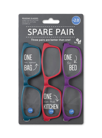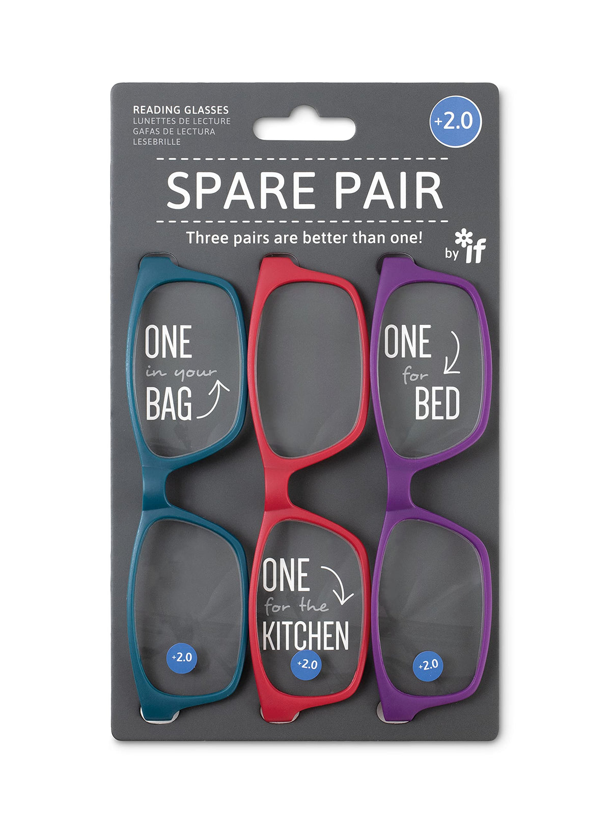 Because three pairs are better than one! This really does exactly what it says on the tin...A set of three pairs of Reading Glasses (all the same strength) to keep in 3 places where you know you'll always need them...In the kitchen, garage, handbag, office, The car, the bedroom; wherever. IF you need reading glasses, or know someone who can't live without them, you'll need spare pair!.