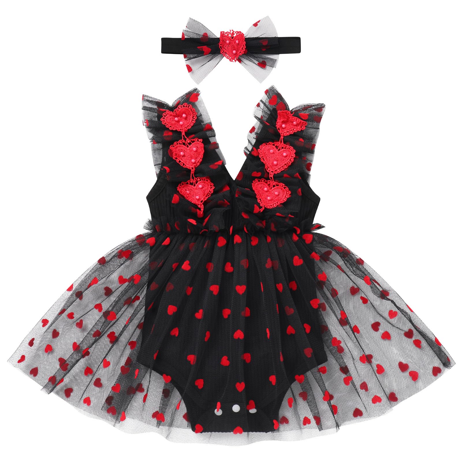 IMEKIS My First Valentines Day Baby Girl Outfit: First Birthday Outfit Girl Cake Smash Photoshoot Newborn Infant 1st Valentines Day Dress for Toddler Cupid Outfits Black + Red Heart 12-18 Months