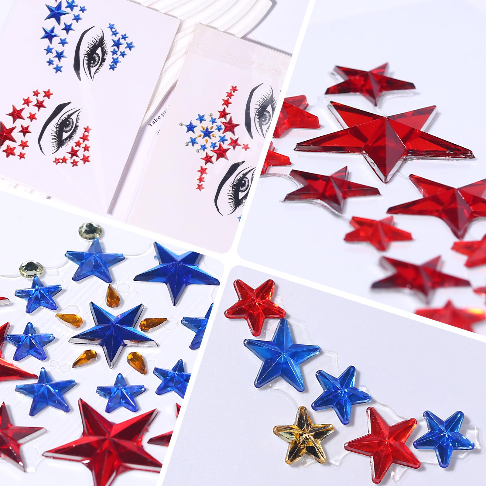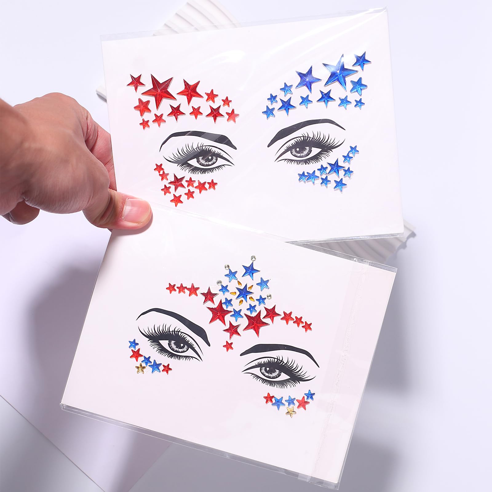 Independence Day Rhinestone Face Stickers Patriotic Temporary Tattoo Stickers Gems for Face Body Red Bllue Self Adhesive Crystal Makeup Diamonds Face Tattoo Sticker Holiday Festival Party Supplies