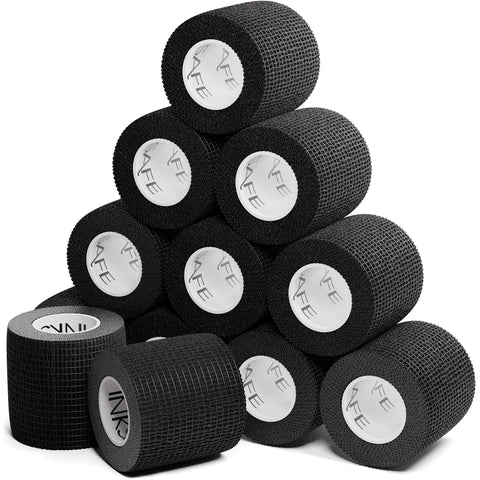 Inksafe Black Self Adhesive Cohesive Bandages 5cm x 4.5m Box of 12 Suitable for Tattoo Grip Wrap, Vet Wrap, Wrist and Ankle Sprains and Swelling. Each ink-safe, cohesive bandage is individually wrapped. Contains latex, color of the disposable bandage: black