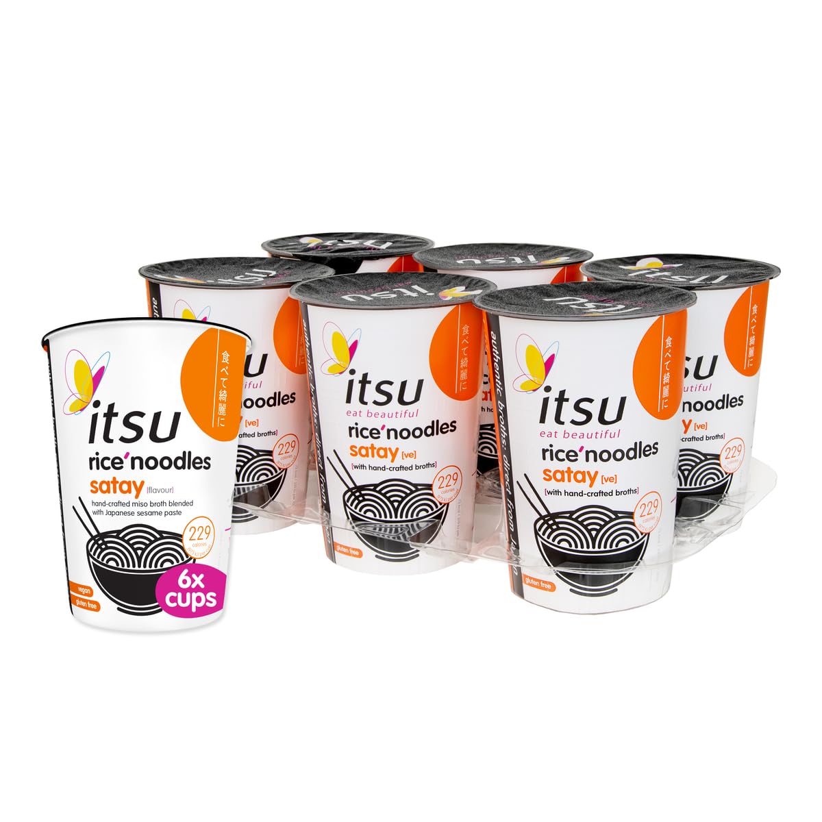 DescriptionProduct DescriptionCarefully crafted, instantly enjoyed. Discover the authentic taste of Japan with itsu satay flavoured rice'noodles. Each multipack contains six cups of instant rice noodles, crafted with care and quality. itsu restaurant-inspired gluten free noodles feature a satay-flavoured miso broth made from paste, not powder, providing a rich and satisfying taste. The noodles are complemented by dried spring onions for an added touch of freshness. Perfect for a quick lunch, supper, or snack, simply add hot water and enjoy a delicious, light meal in minutes. itsu Satay Flavour Rice Noodles are low in fat and sugar, with only 229 calories per cup, gluten-free and suitable for both vegetarians and vegans. Hand-crafted in Japan by Yoshihiro, a respected food entrepreneur, our broths are made from scratch in the stunning Nagano Valley, using miso, herbs, and spices without any artificial additives. Embrace the convenience of instant noodles without sacrificing quality or taste, and enjoy a meal that you can eat with pride and joy. Since 1997, itsu has been dedicated to serving healthy, Asian-inspired dishes in their 70 award-winning restaurants. Now, with itsu [grocery], we bring our beloved flavours to supermarkets, health food stores, and online shoppers worldwide. From crispy seaweed thins to frozen gyoza, brilliant broths, miso easy, and rice noodles, itsu offers a range of products that make eating beautifully easy and accessible. Each limited-edition origami pack offers the chance to win the ultimate £10k trip to Japan [for 2] & thousands of itsu eVouchers*. *UK, 18+. Purchase, smartphone & internet required. Purchase between 19/08/24 - 31/12/24. For a chance to win, visit the itsu website. Enter details and the 8-digit code starting with L (on the bottom of cup) & choose preferred eVoucher retailer. Prizes: 1x dream trip to Japan for 2 (worth £10,000) via prize draw and itsu eVouchers via instant win. 1 of 3,000 x £1.00, 1,000 x £3.00 or 300 x £5.00 eVouchers redeemable against Itsu products sold in supermarkets 19/08/24 - 31/12/24 (excl. Petrol stations, online & in Itsu restaurants). Max. 1 entry per pack purchased. Max. 1 EVoucher per person per day. Retain receipt. Visit the itsu website for full T&Cs and prize details. Promoter: Itsu [Grocery] Ltd. SW1H 0EUIngredientsRice noodles (62%) (rice, modified tapioca starch, sugar, salt, stabiliser: guar gum), broth paste (36%) (soybean paste [water, soya beans, rice, salt], sesame paste, tamari soy sauce [water, soya beans, salt, alcohol], water, sugar, sesame oil, alcohol, yeast extract powder, salt, garlic powder, paprika powder, onion powder, coriander, chilli pepper, ginger powder), red pepper, leek.DirectionsEmpty noodles, paste and vegetable sachet into cup. Add boiling water to fill line. Stir and wait 5 minutes. Add a splash of cold water if too hot.Safety WarningContents will be very hot. Do not put lid back on after preparation. Not suitable to microwave.Box ContainsEach box contains 6 cups of itsu Satay rice'noodlesManufacturer Contact Informationitsu [grocery] ltd, 1st Floor, 16a Great Peter Street, London SW1P2BX