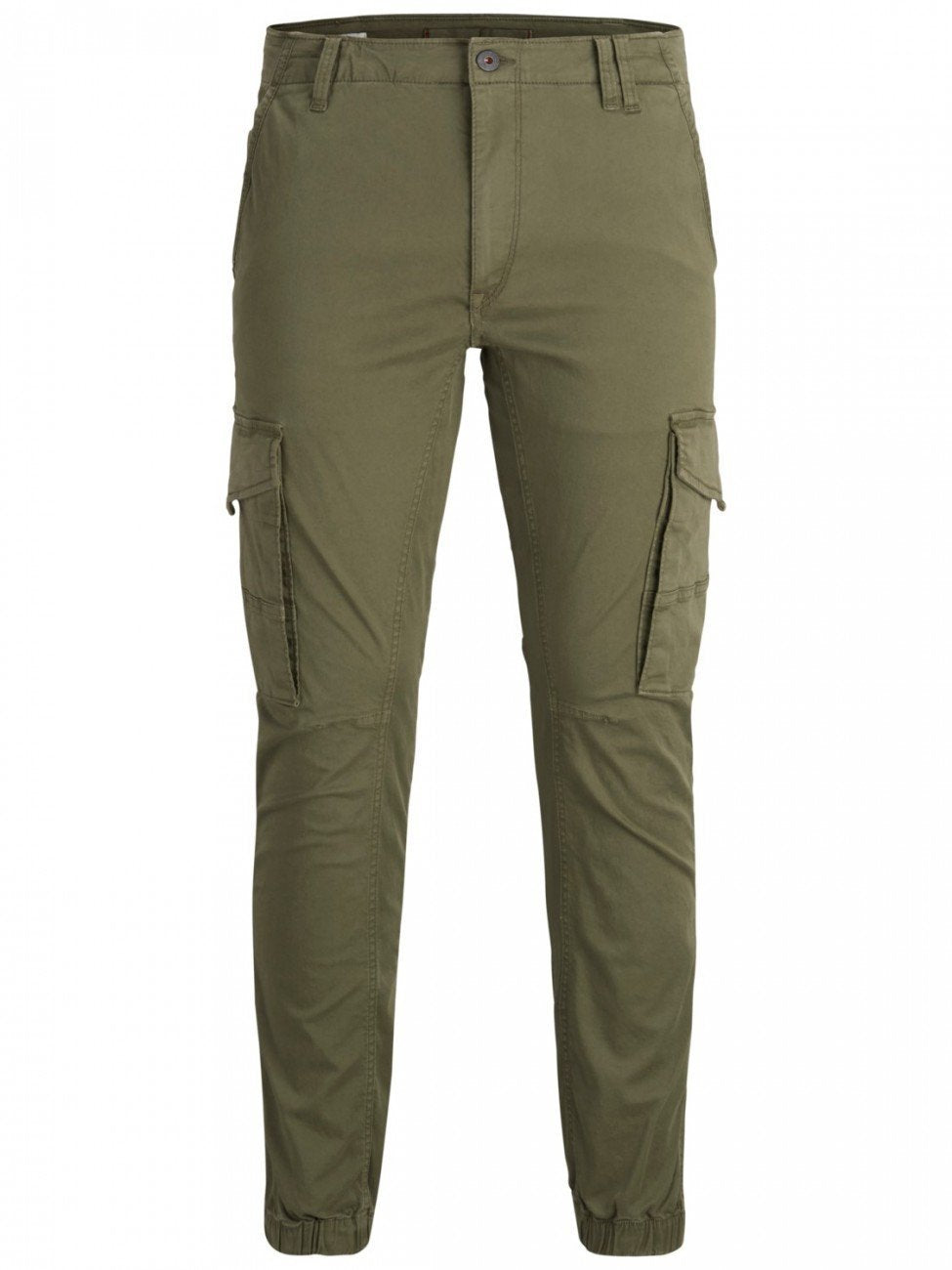 DescriptionSturdy and casual are these cargo pants by JACK & JONES. The pants made of canvas fabric, have side pockets like a chino and back pockets with flaps. In the for cargo pants indispensable pockets on the lateral thighs, any small items can be stowed.