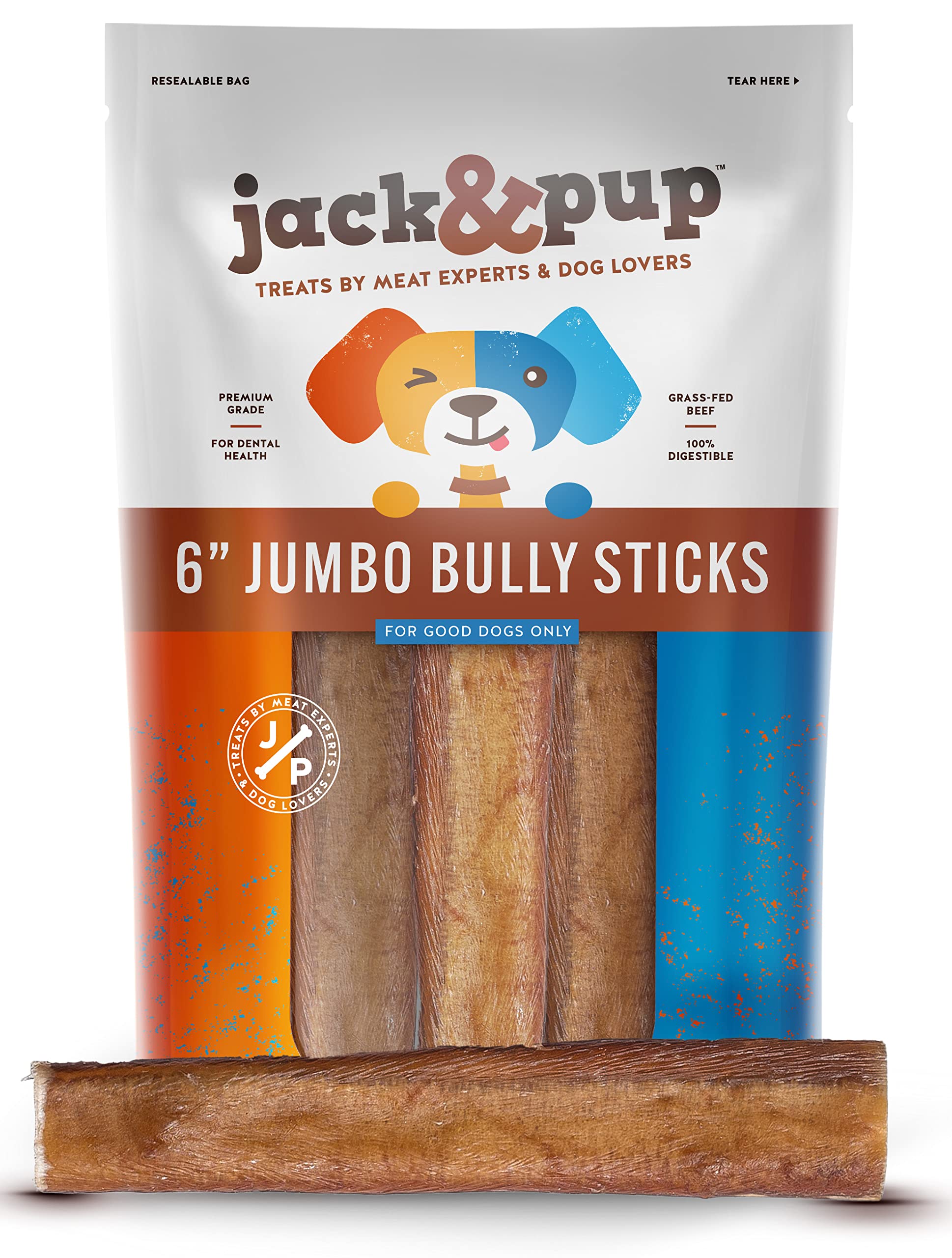 Jack&Pup Premium Grade Bully Sticks are carefully prepared by boiling, roasting and smoking; then drying in a slow process. The multi-step process effectively locks-in the natural beef flavor resulting in an enhanced richness that dogs love. At the same time, the propriety process naturally eliminates all odors, without the use of any additives or chemicals. Stays fresh longer without any added preservatives. Sourced from grass fed, free range cattle; raised without any added hormones or antibiotics, resulting in a healthier and better tasting treat. Processed in a USDA Human Grade Certified and Inspected facility. Each bully stick is handpicked and inspected to ensure quality, texture and perfect consistency. Your canine will enjoy its’ delicious and fresh meaty flavor! Guaranteed to be fully digestible and guaranteed not to cause any side-effects. Jack&Pup Bully Sticks are a natural, low-fat and protein-rich, one-ingredient dog chew treat, being 100% beef muscle without any additives or artificial ingredients. Our careful and natural preparation of the bully sticks effectively eliminates all bacteria and contaminates; making its’ consumption fully safe.About Jack & Pup: Jack & Pup is a company founded by meat experts. As pet lovers, we set out to create naturally healthy dog treats from premium meat sources. This means consistent high quality in every package. Jack & Pup is every pet family’s favorite! Size: 6 Inches longThickness size: Jumbo-thick Quantity: 6 sticksGuaranteed Analysis: Crude Protein (min): 75% Moisture (max): 14.5% Crude Fiber (max): 3.5 % Crude Fat (max): 3.5 %Country of Origin: Brazil