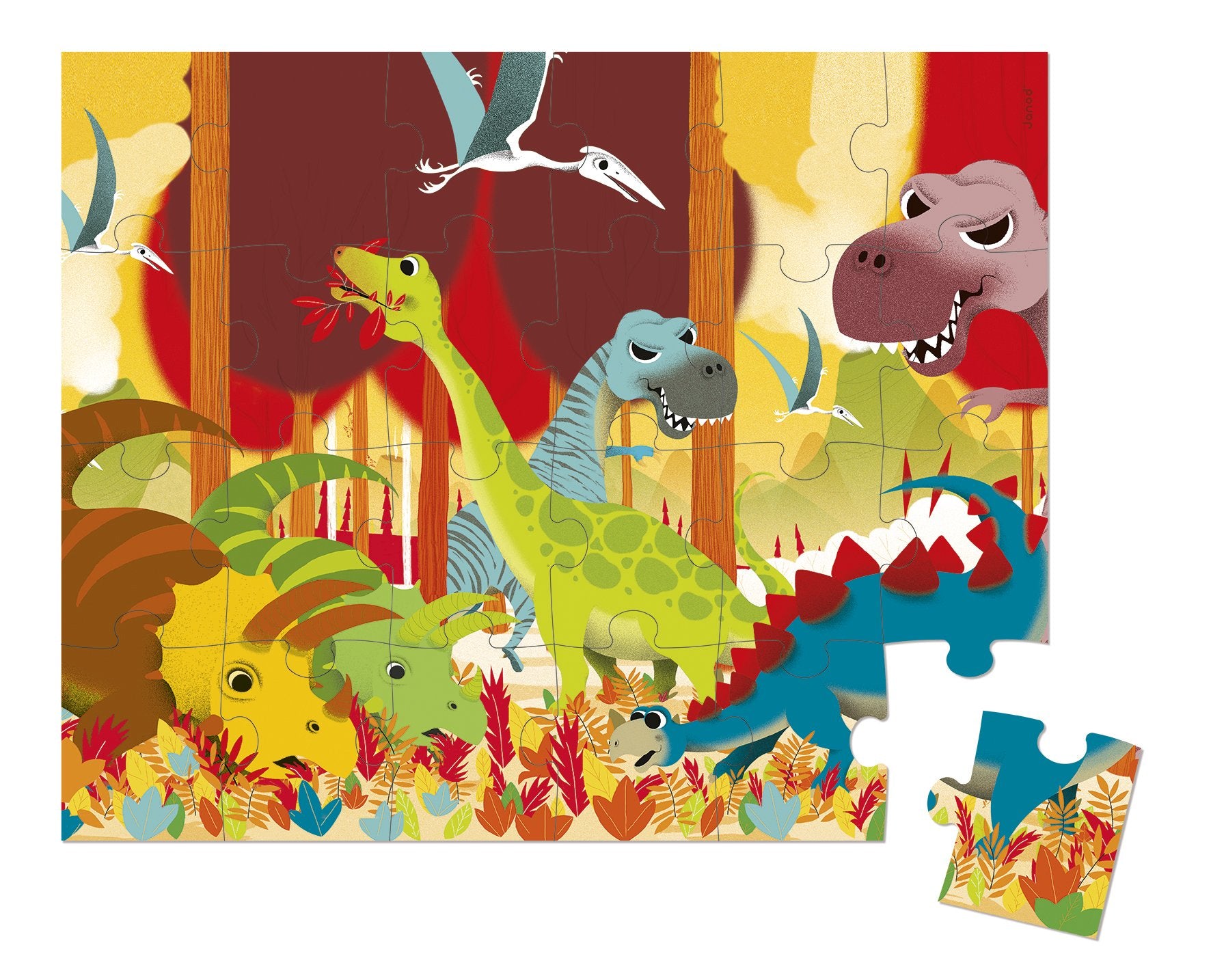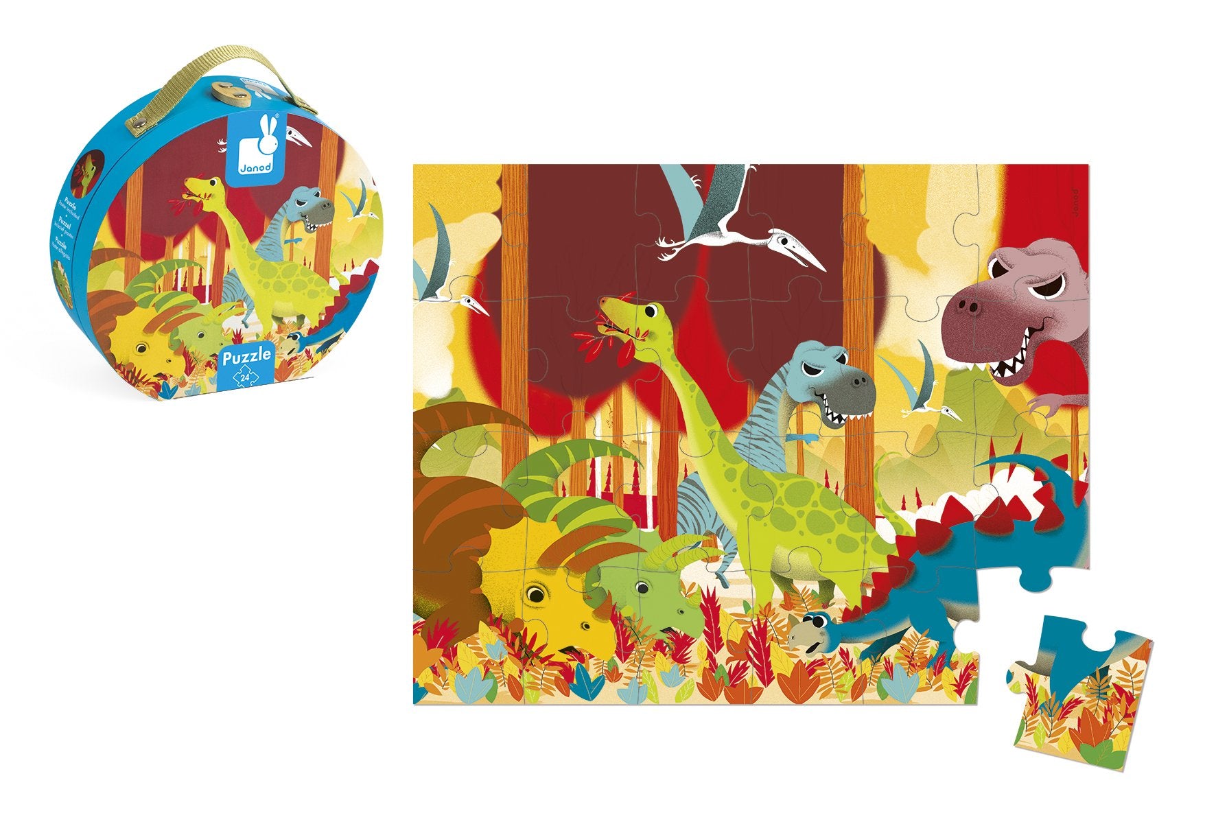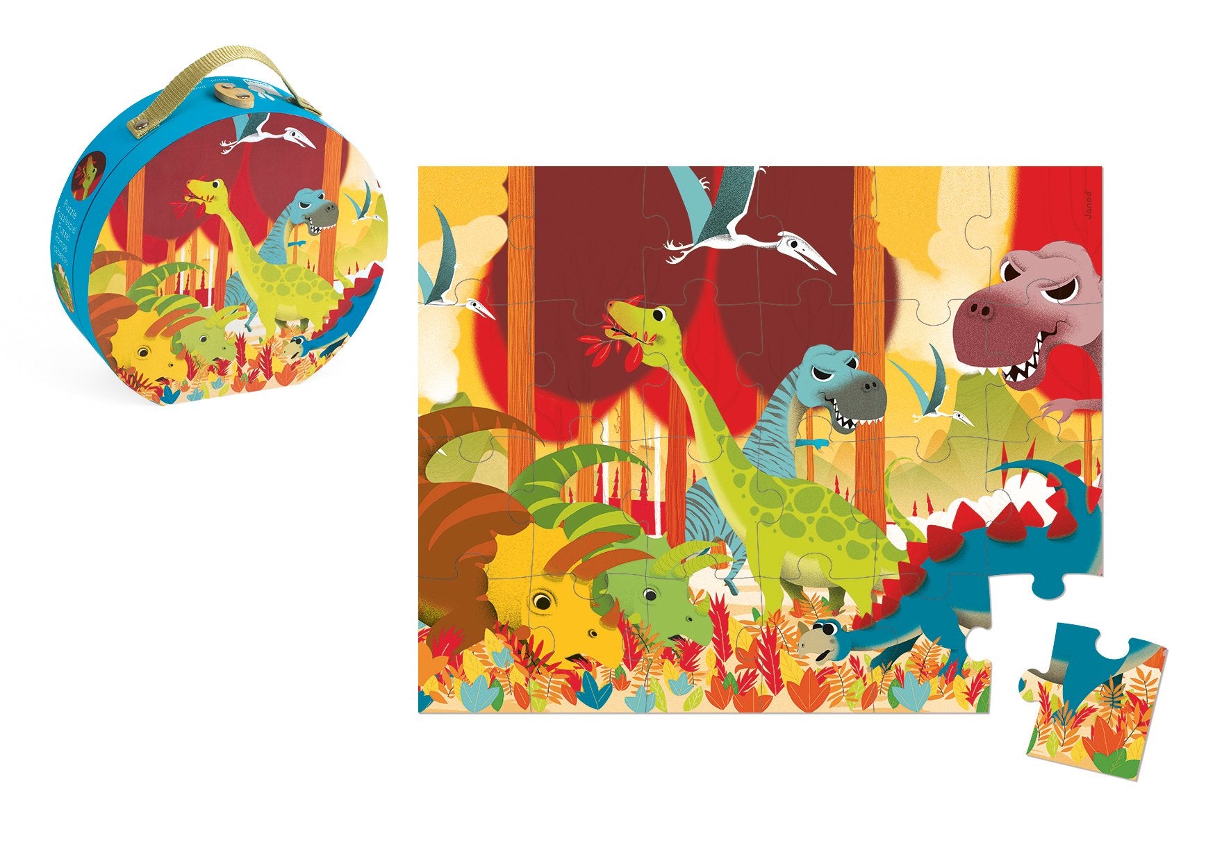 Janod Dinosaurs Hat Boxed Puzzle features twenty four large pieces, perfect for little hands. All of your favorite dinosaurs including the T-Rex, Pterodactyl and Stegosaurs are included in this Jurassic panorama that comes presented in a suitcase made from sturdy card. The carry handle makes the Dinosaur puzzle perfect for entertainment on the go and storage is easy in the playroom. Recommended for ages 3 years and older.