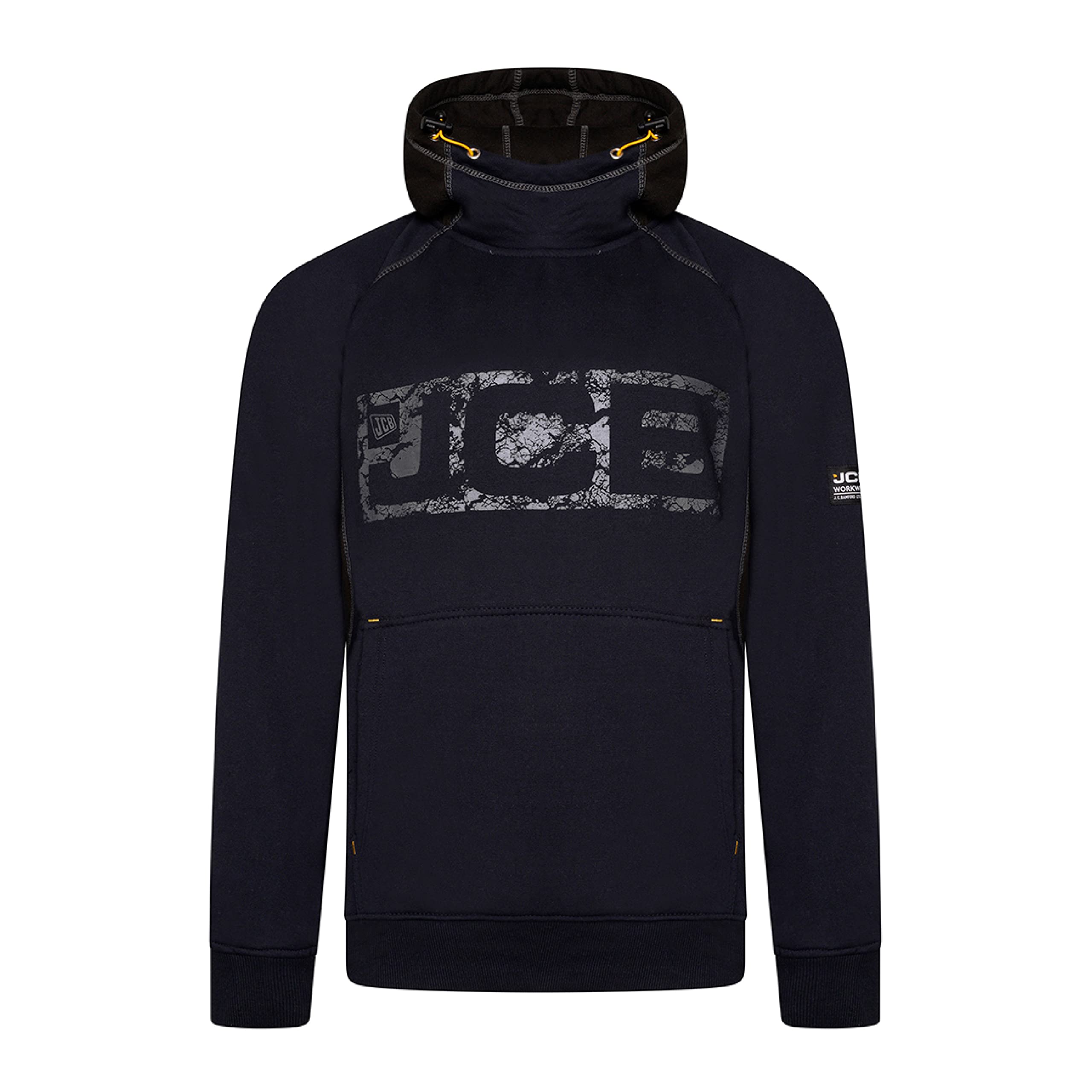 80% cotton, 20% polyester, 320gm. Heavyweight, cotton rich fabric, lined, snood type, hood with drawstring, kangaroo pouch front pocket, thumb grips sewn into cuffs.