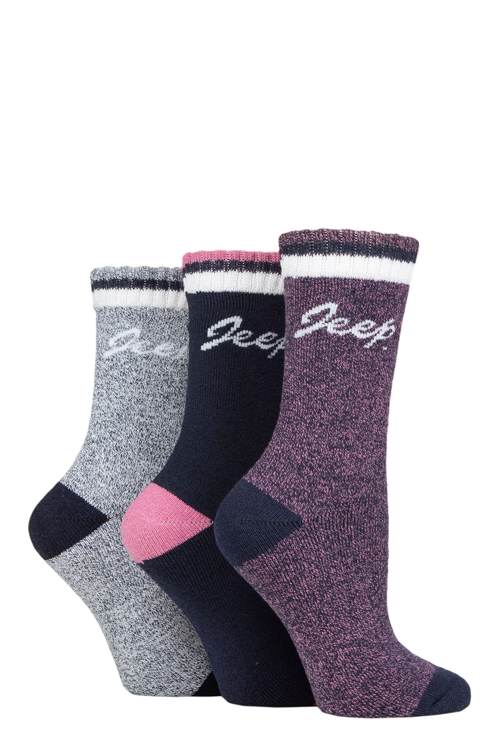 Attractively styled in a multicolour mix of marl and plain yarns, with sports stripe cuffs and Jeep signature branding, these ladies’ Jeep Performance Full Cushion Boot Socks are surpassingly lightweight, made using a blend of performance poly fibres and natural cotton, making them soft next to the skin but also durable for a range of pastimes and activities. These three pairs of crew length ladies’ boot socks are terry loop cushioned right from the cuffs and through to the toes, protecting your ankles and feet. The woven-in elasticated arch support bands give lift at the mid-foot and helps to keep the socks comfortably, securely in place.