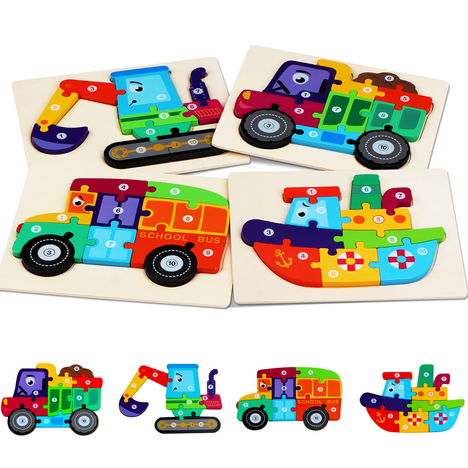 This wooden toddler puzzles set contains 4 pack different transportation puzzles with bright colors and vivid designs, can attract children's attention and make children learn through play, develop children's patience, imagination, concentration, colors & shapes recognition and hand-eye coordination. This wooden puzzle is definitely a perfect parents’ choice for toddler toys!