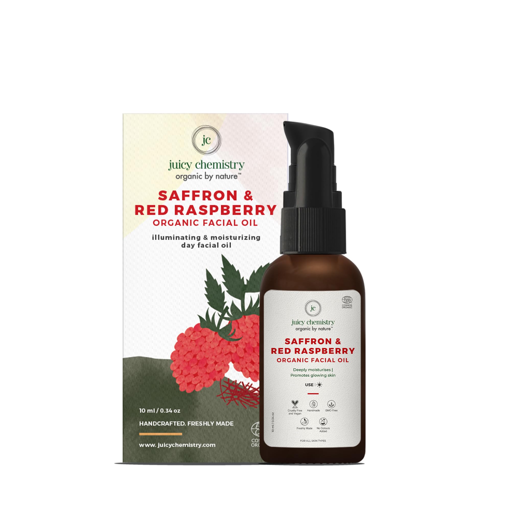 Juicy Chemistry Saffron & Red Raspberry Facial Oil, 10 ml | Organic Face Oil for Skin Brightening & Moisturising | Ecocert Certified for Men & Women | Cruelty-free & 100% Vegan