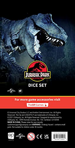 Take prehistoric probability to your next game night with this Jurassic Park-approved set of dice! This 6-sided dice set features your favorite dinosaurs from the classic 90s sci-fi blockbuster including the T-Rex, Brachiosaurus, Velociraptor, Triceratops, and Dilophosaurus.