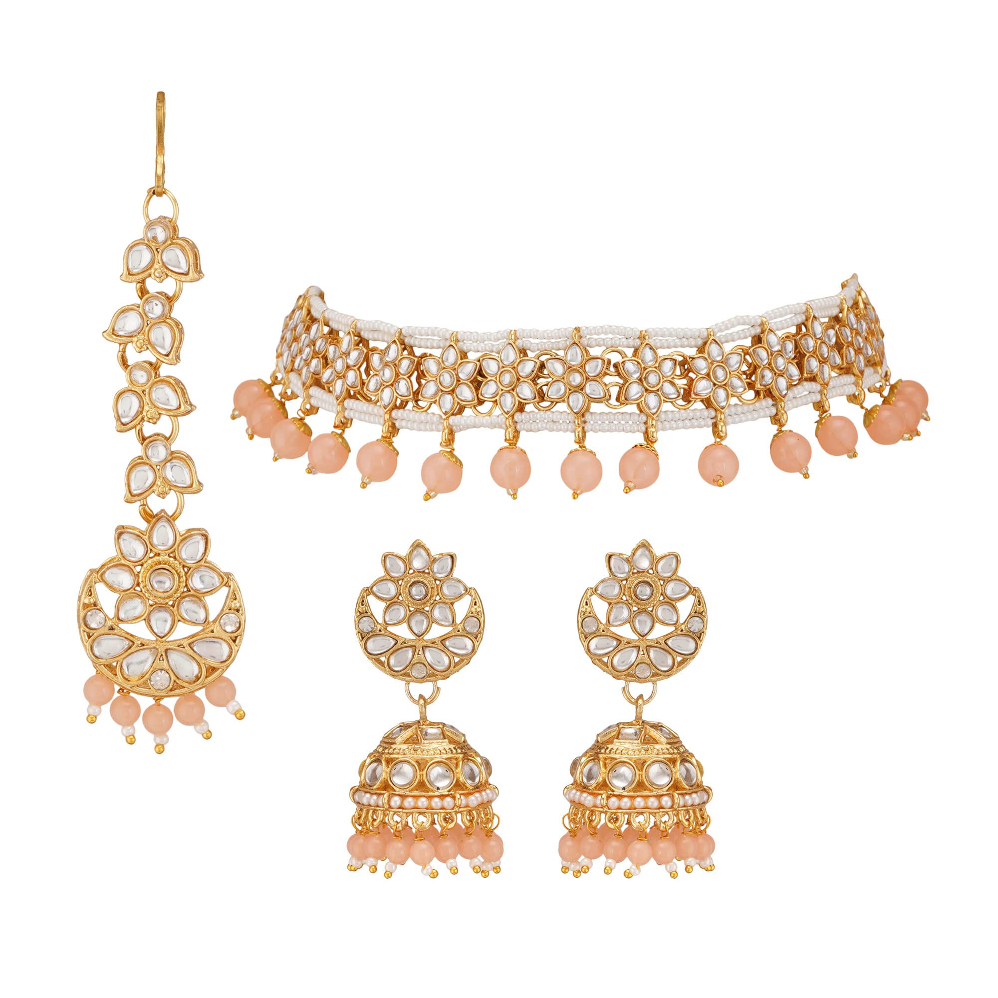Jwellmart Gold Plated Faux Kundan Pearl Bridal Wedding Choker Necklace Earrings Tika Combo Set Bollywood Party Traditional Fashion Indian Jewelry Jewellery Set for Women (Peach)