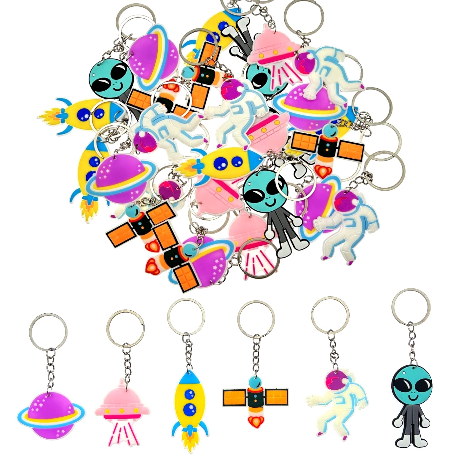 JZK 30x Astronaut themed party decorations, space themed party accessories, UFO Alien Rocket keyrings keychain set, children birthday party favours, kids party thankyou gift