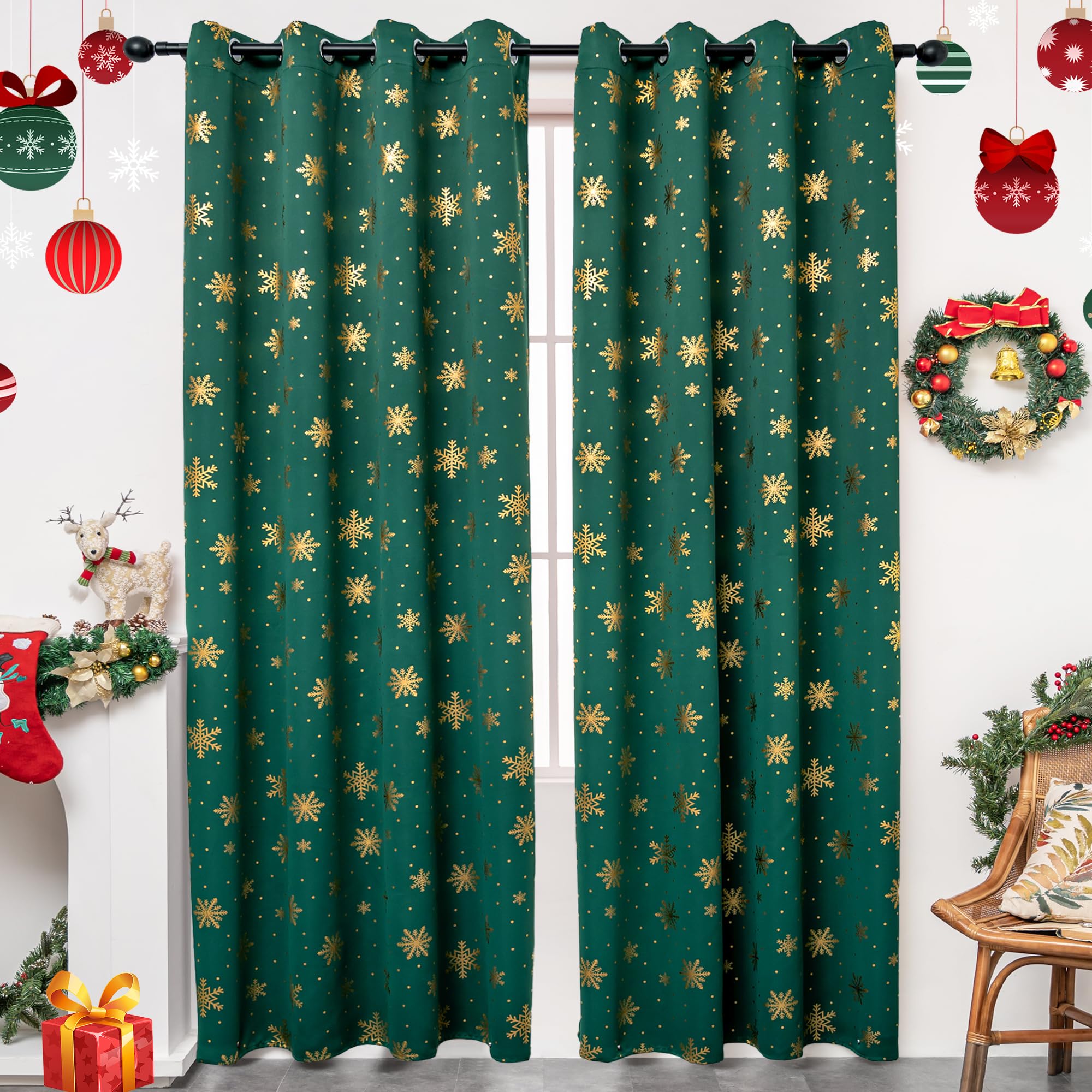 Karseteli Snowflake Christmas Curtains for Living Room, Luxury Gold Foil Print Blackout Curtains, Xmas Decorations and Holiday Decor Set of 2 Panels Green 52 x 84 Inch