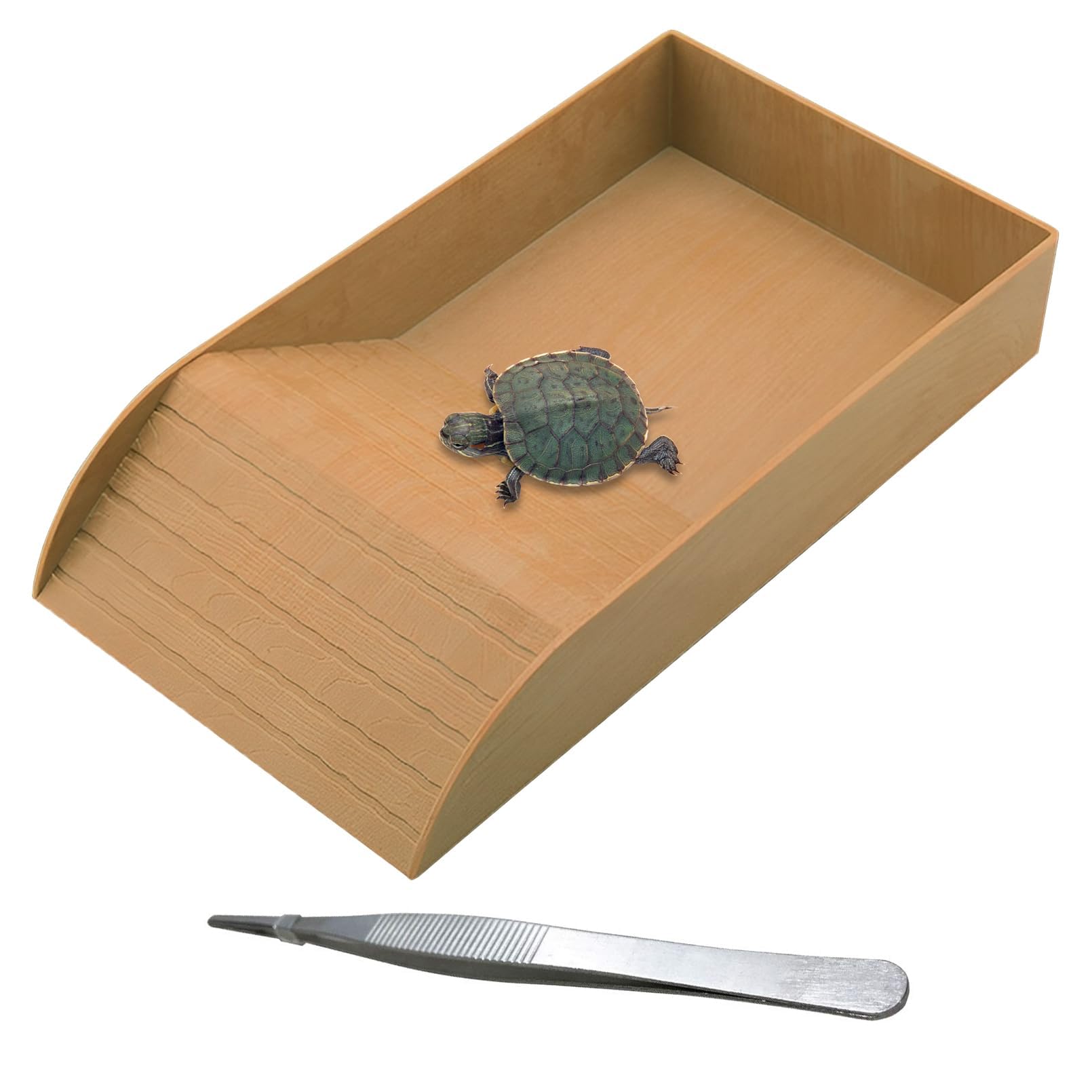 kathson Reptile Tortoise Turtle Feeding Dish with Ramp and Basking Platform Plastic Turtle Food and Water Bowl Also Fit for Bath Horned Frogs Lizards Amphibians (Brown, Emulational Wood)