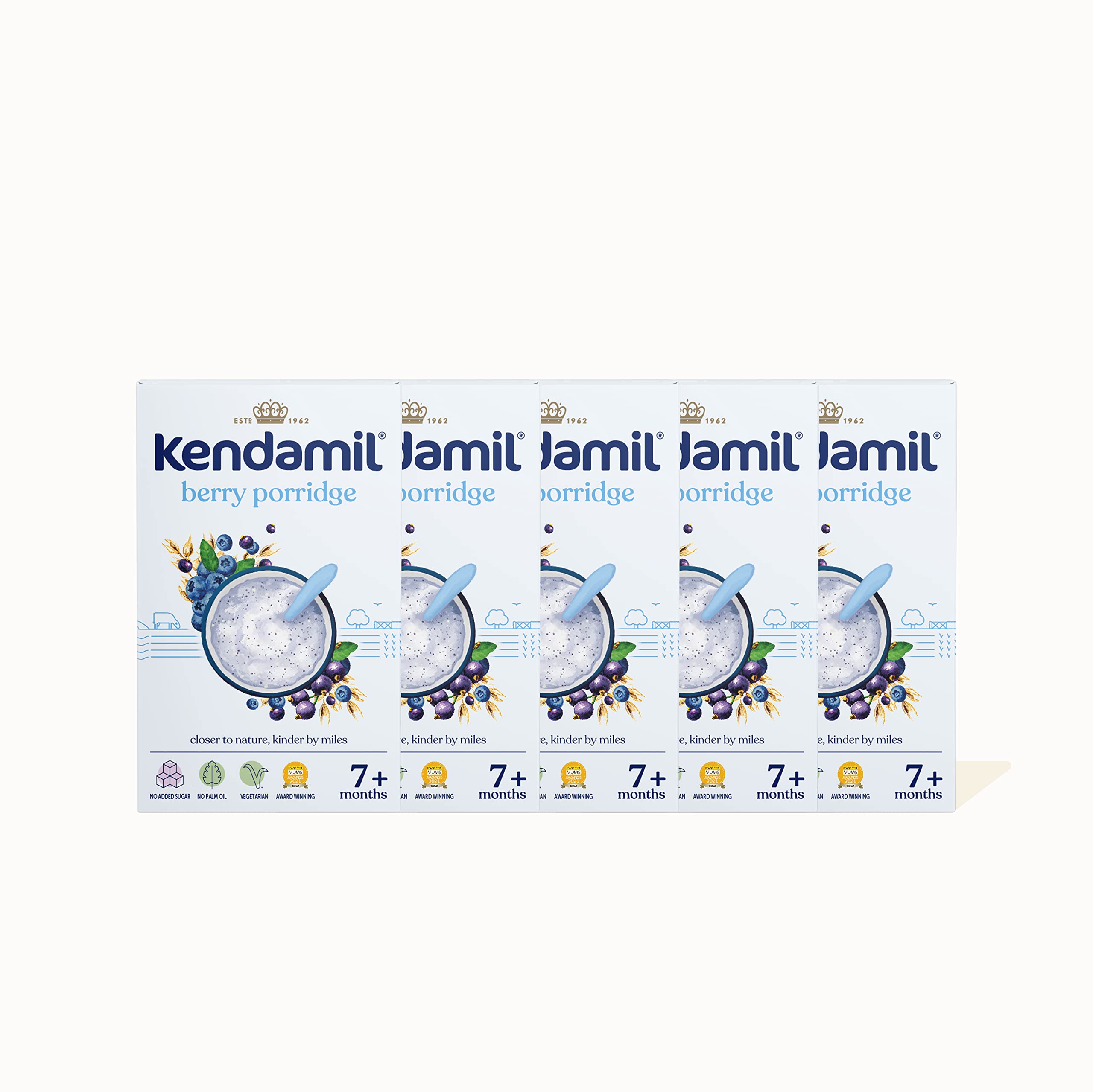 Kendamil is a British family business with 60 years experience in producing baby milk and weaning cereals. From our family, to yours. Berry Baby Porridge with fortified milk, suitable for babies from 7 months plus as part of varied weaning diet. Pack size: 5 x 150g No added sugar No Palm Oil No GMOs Vegetarian Award Winning - Made For Mum's Best Baby Breakfast Food 2021 Proud winners of the Queen's Award 2020