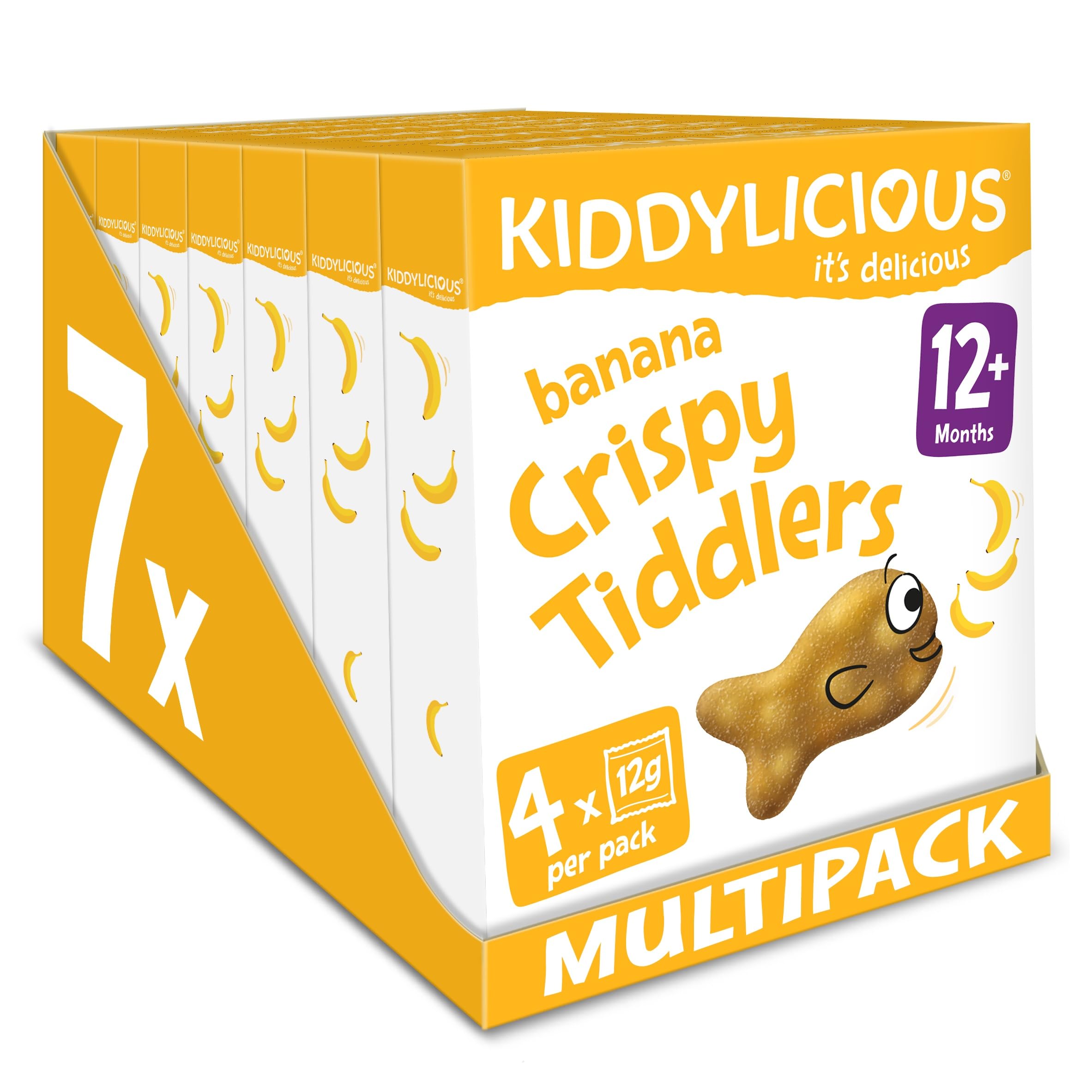 DescriptionProduct DescriptionKiddylicious Crispy Tiddlers are ideal healthy sweet treat for your little ones. These fruity kids snacks are made from real fruit puree and fruit juice, whizzed up with little rice pieces and set into fun shapes! As well as being the perfect snack for little ones they’re also great for topping cakes, decorating biscuits and adding to desserts. Plus they’re one of your babies 5 a day!IngredientsApple juice concentrate (35%), Pear juice concentrate (35%), Banana puree (17%), Puffed rice (8%), Banana flakes (3.5%), Natural flavouring, Gelling agent: Pectin, Citrus fibre, Lemon juice concentrate. Fruit content: An average of 298g of apple, 278g of pear and 44g banana have been used to prepare 100g of banana crispy tiddlersManufacturer Contact InformationKiddylicious, PO Box 926, Amersham, HP6 9JL