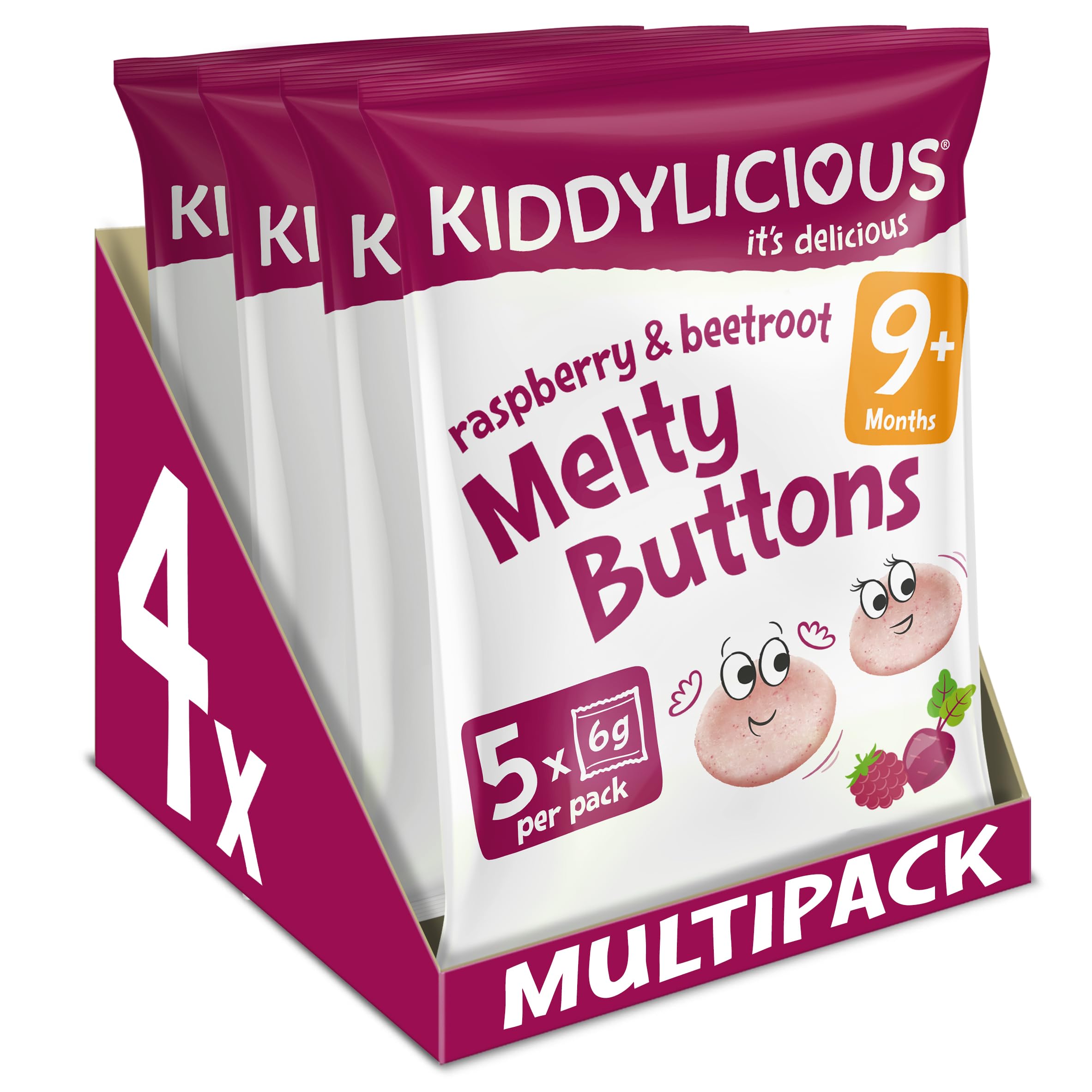DescriptionProduct DescriptionOur Melty Buttons will help your little ones through their journey to solid food and their development as they grow. With two yummy flavours to choose from and by introducing vegetable flavours, babies will experience a variety of new tastes, which is important to avoid fussy eaters in the future. Melty Buttons snacks have no added salt and are free from artificial flavours, colours or added preservatives.IngredientsJasmine rice flour, raspberry powder (9.2%), sunflower oil, tapioca starch, banana powder, apple juice concentrate, beetroot powder(1%), natural raspberry flavour, Vitamin E (mixed tocopherols) added to preserve freshness, thiamine (Vitamin B1)DirectionsPop one of these in your bag for a tasty snack wherever you areSafety Warning0Manufacturer Contact InformationKiddylicious, PO Box 926, Amersham, HP6 9JL