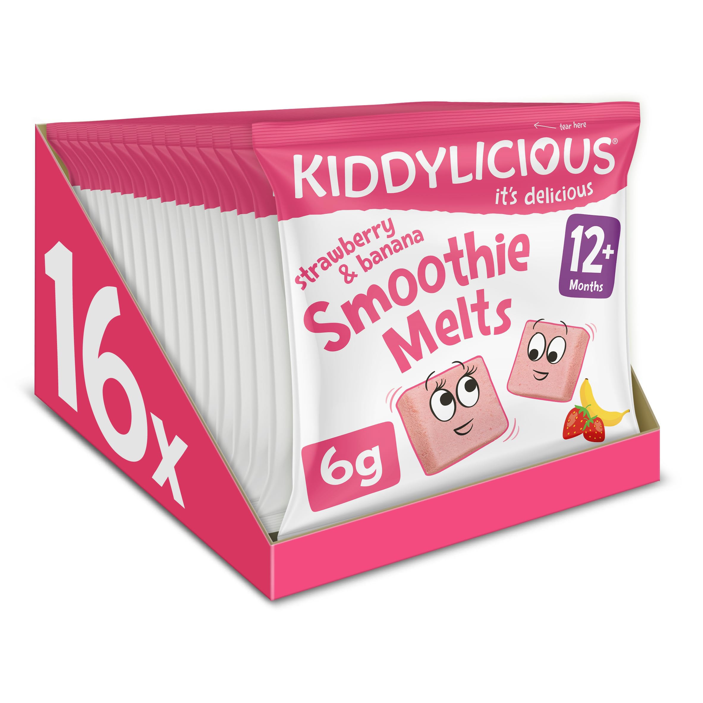 DescriptionProduct DescriptionEach little melt is a mini ‘square’ of puréed fruit that bursts with flavour once popped in your mouth, then simply melts away on your tongue. Toddlers love the taste and melting sensations and we can relax knowing they are learning how fantastic new and different foods can be. Each little Kiddylicious smoothie melt bag provides at least 1 of the recommended 5 fruit or veg portions a day - just the thing to pop in your bag for when out and about, perfect for lunchboxes and also really great for fruity toppings on cakes and home baking. See what you think as they dissolve in your mouth - just like a smoothie drink!Ingredients100% fruit - Banana, Strawberry Contains naturally occurring sugarsBox Containseach order comes with 16x individual packs within 1 box