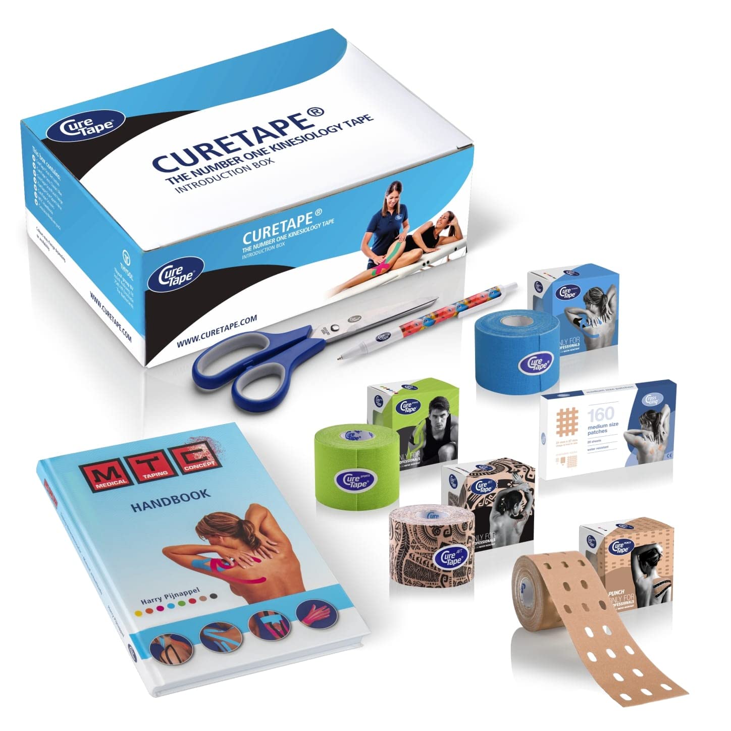 CureTape Introduction Box - 1 x CureTape Classic Blue (5cm*5m) - 1 x CureTape Sports Lime (5cm*5m) - 1 x CureTape Punch Beige (5cm*5m) - 1 x CureTape Art Tattoo (5cm*5m) - 1 x CureTape Soft touching Scissors - 1 x MTC Handbook (ENG) - Harry Pijnappel”