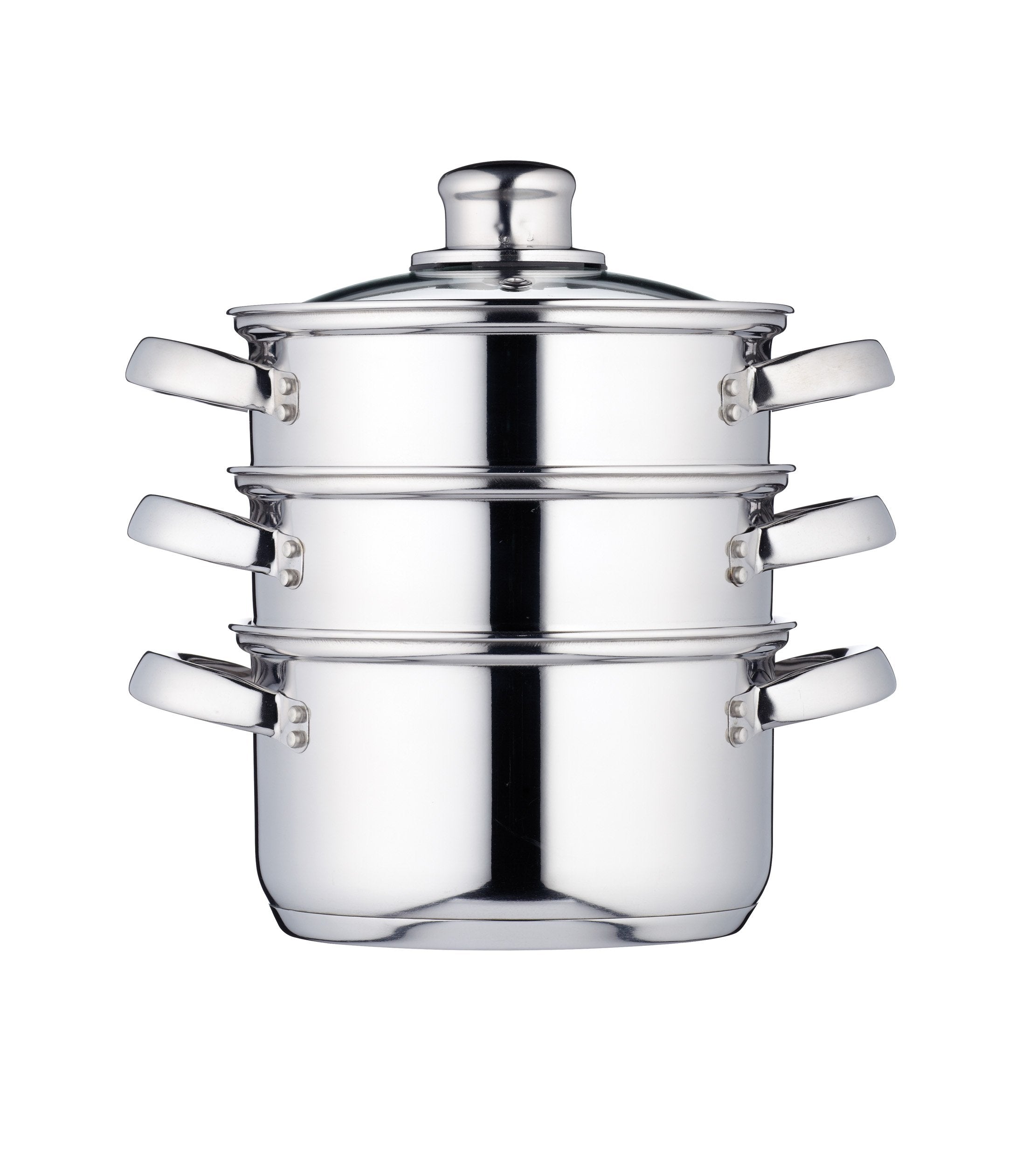 Product DescriptionNo kitchen is complete without this essential 3 tier food steamer pan. This vegetable steamer set is robustly constructed, with strong, riveted handles, and a toughened glass lid. The encapsulated base ensures even heat distribution, and the tiers are calibrated for a snug fit, so there’ll be no steam escaping when it could be heating your ingredients. And best of all, by using one ring, it reduces fuel bills. Plus it saves space on your hob when you’re cooking big dinners or multiple courses.Set Contains:16cm steamer