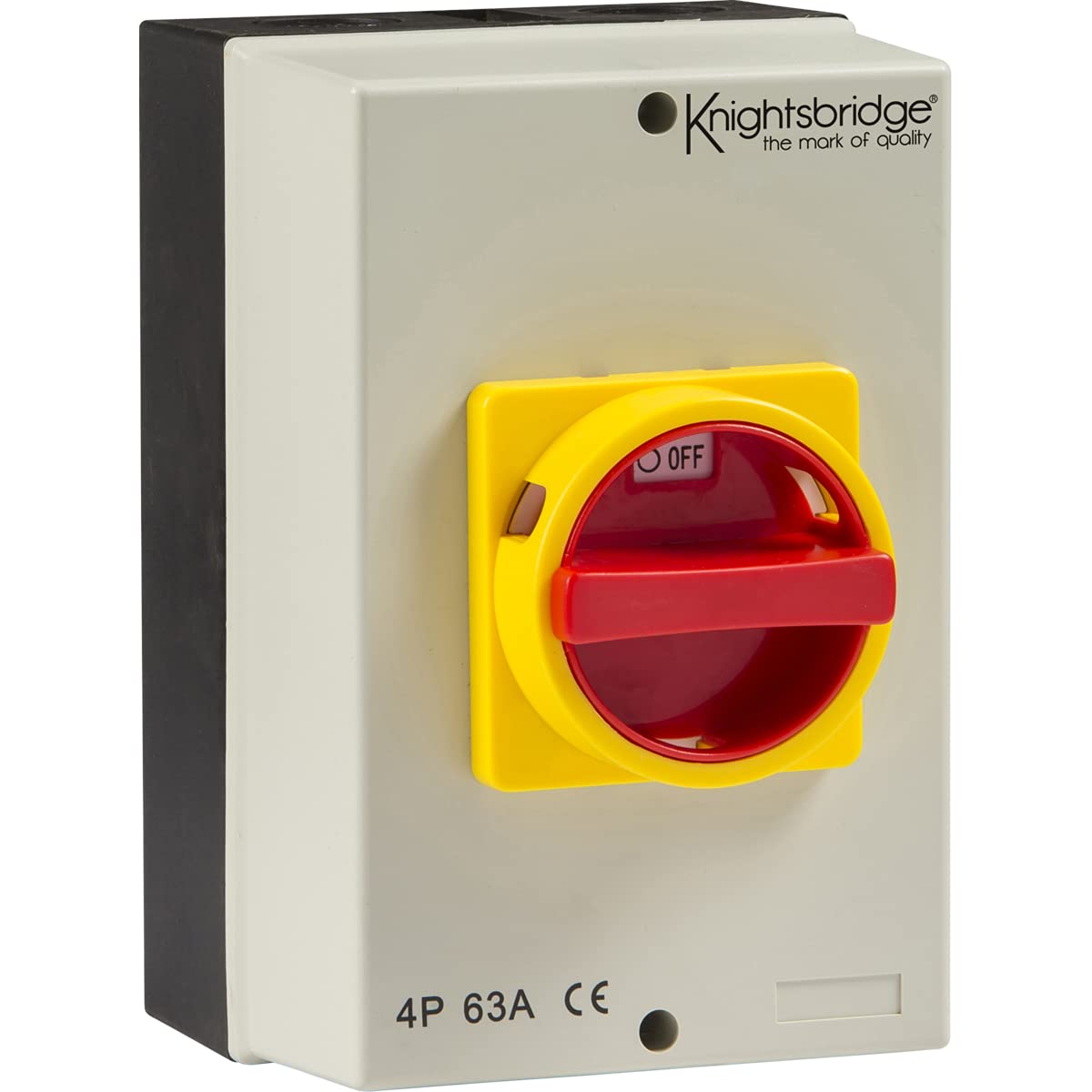 Product DescriptionInsulated 4 pole AC (230V-415V) ~ IP65 rated ~ 63A ~ easy access via M20 knockouts ~ red/yellow handle ~ switch interlocks with lid to prevent opening whilst in ON position ~ includes earth terminals. Complies to the latest relevant safety standardsSet Contains:IP65 63A Rotary Isolator 4P Ac (230V-415V)