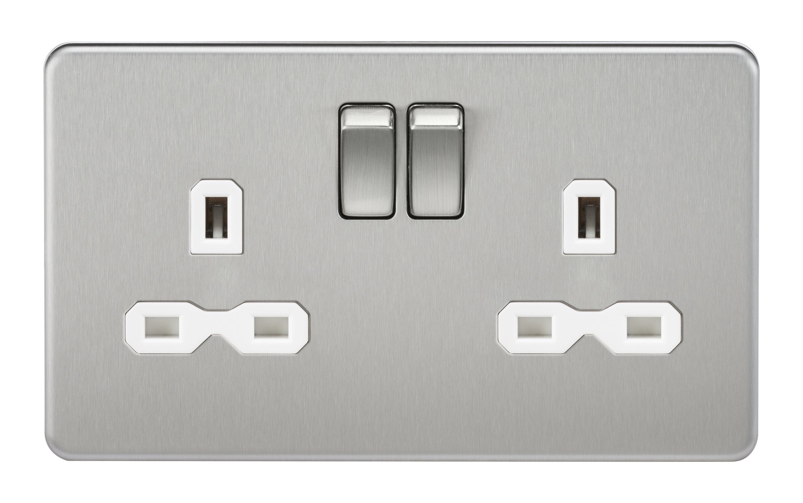 Knightsbridge SFR9000BCW flat plate screwless 13 amp 2 gang double pole switched socket - brushed chrome with White insert. Ideal upgrade to existing double switched sockets around the home. 13A rated with DP switch.