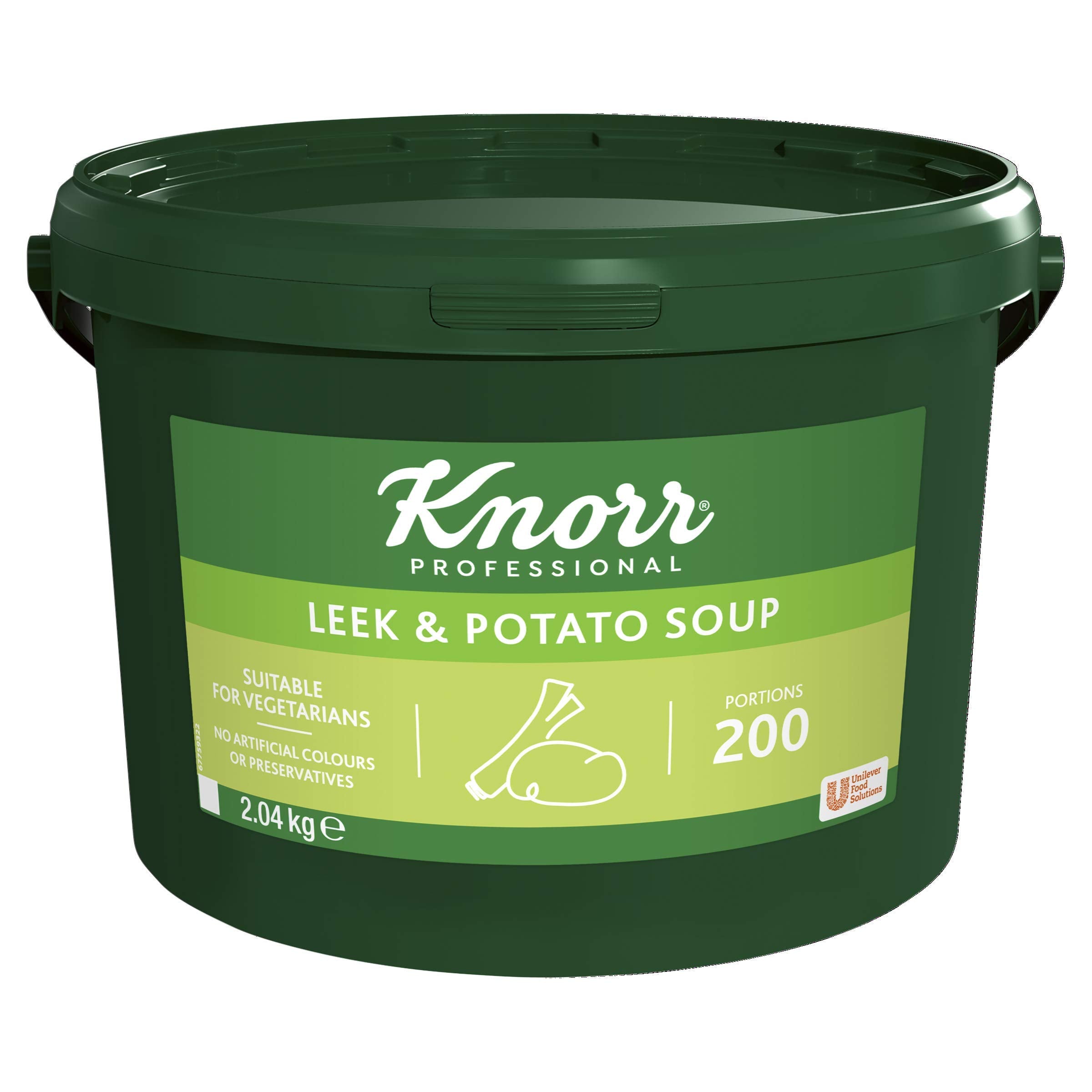 DescriptionProduct DescriptionDehydrated Leek & Potato Soup Mix. This Leek and Potato Soup is a simple, powdered and delicious soup which is easy to use and a great way to minimise waste. Simply combine the powder with boiled water and stir until it thickens. Makes 34 litres of soup or 200 portions.IngredientsPotatoes1 (33%), Potato Starch, Salt, Vegetable Oils (Sunflower, Corn), Leek1 (4.8%), Sugar, Onion Powder, Glucose Syrup, Yeast Extract, Flavourings, Garlic Powder, Pepper, Turmeric, 1Made from Sustainably grown ingredientsManufacturer Contact InformationUnilever Food Solutions, Unilever UK, Freepost ADM 3940, London, SW1A 1YR. Unilever Food Solutions, Unilever Ireland, 20 Riverwalk, Citywest Business Campus, Dublin 24.