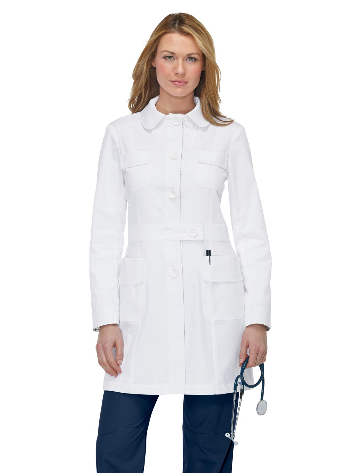 Button-front lab coat with 4 pockets and contrast facing on sleeves, neck and plackets.