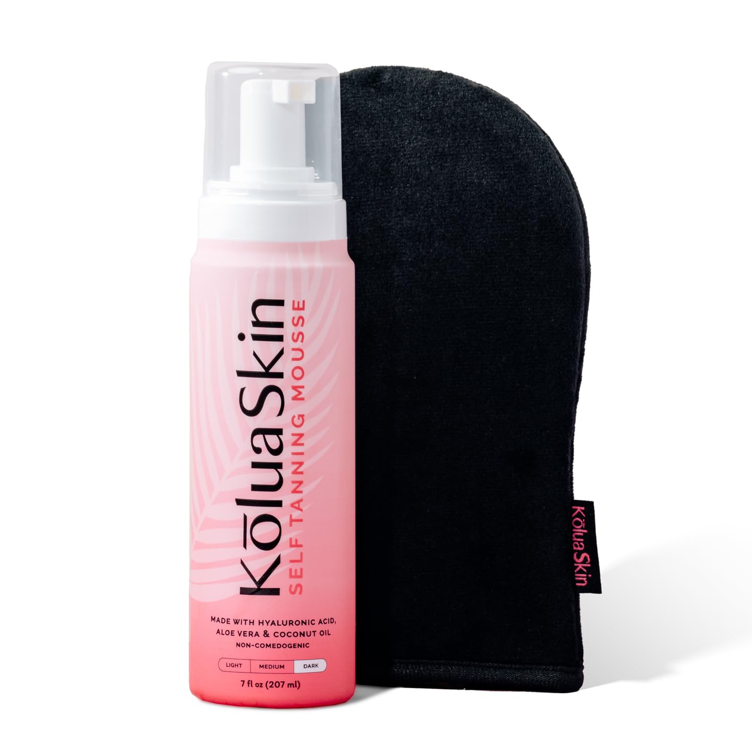 KoluaSkin’s Self Tanning Mousse Bundle comes with an easy-to-use mit and our beloved Dark Mousse. The mousse is made with a blend of skin-loving ingredients including hyaluronic acid, aloe vera, and coconut oil to provide your skin with hydrating, antioxidant, and nourishing benefits while delivering a safe, sun-kissed, natural tan that lasts for up to a week. Our ingenious lightweight mousse dries quickly and evenly without streaks, won’t stain, has been dermatologist tested, and is proven not to clog pores. So get glowing!