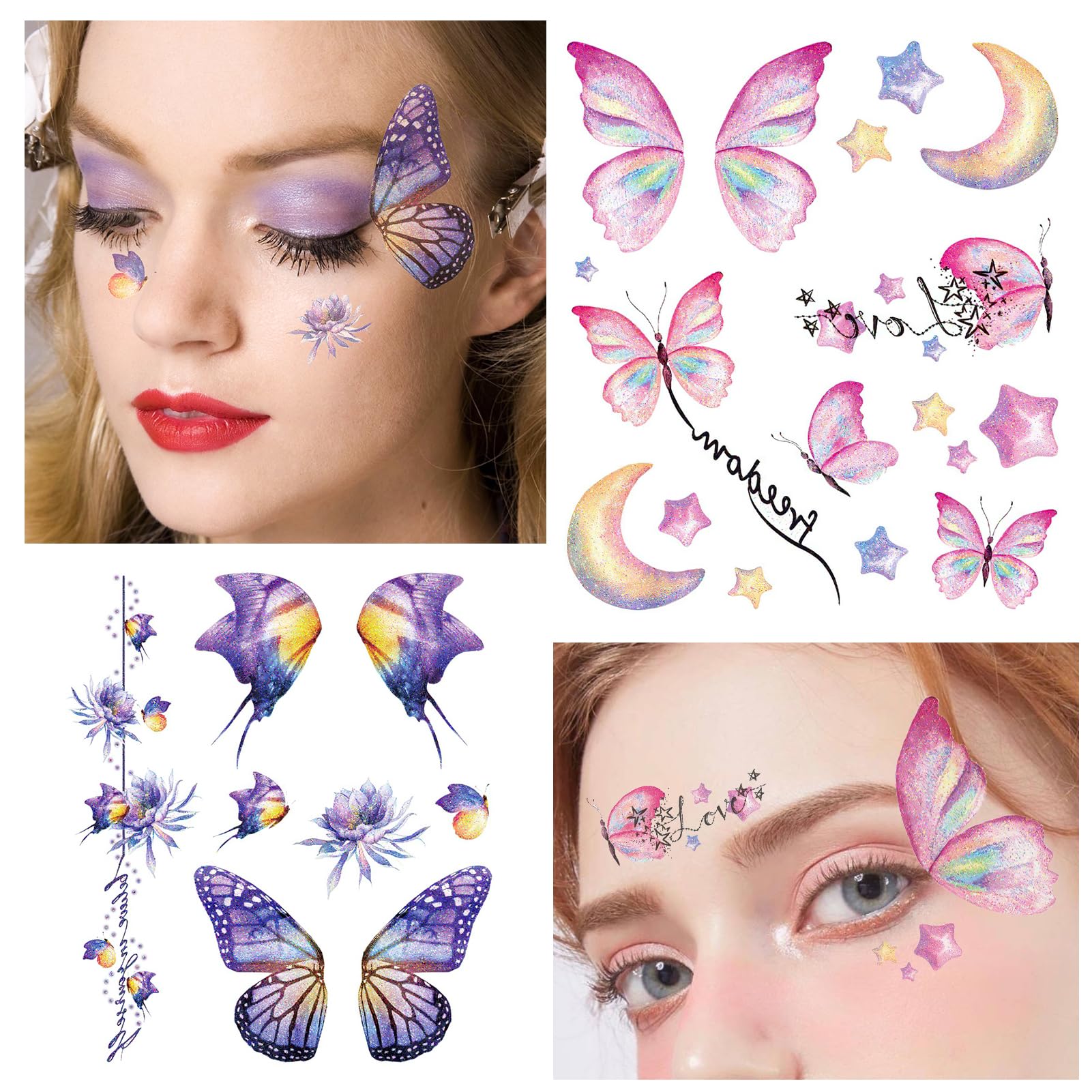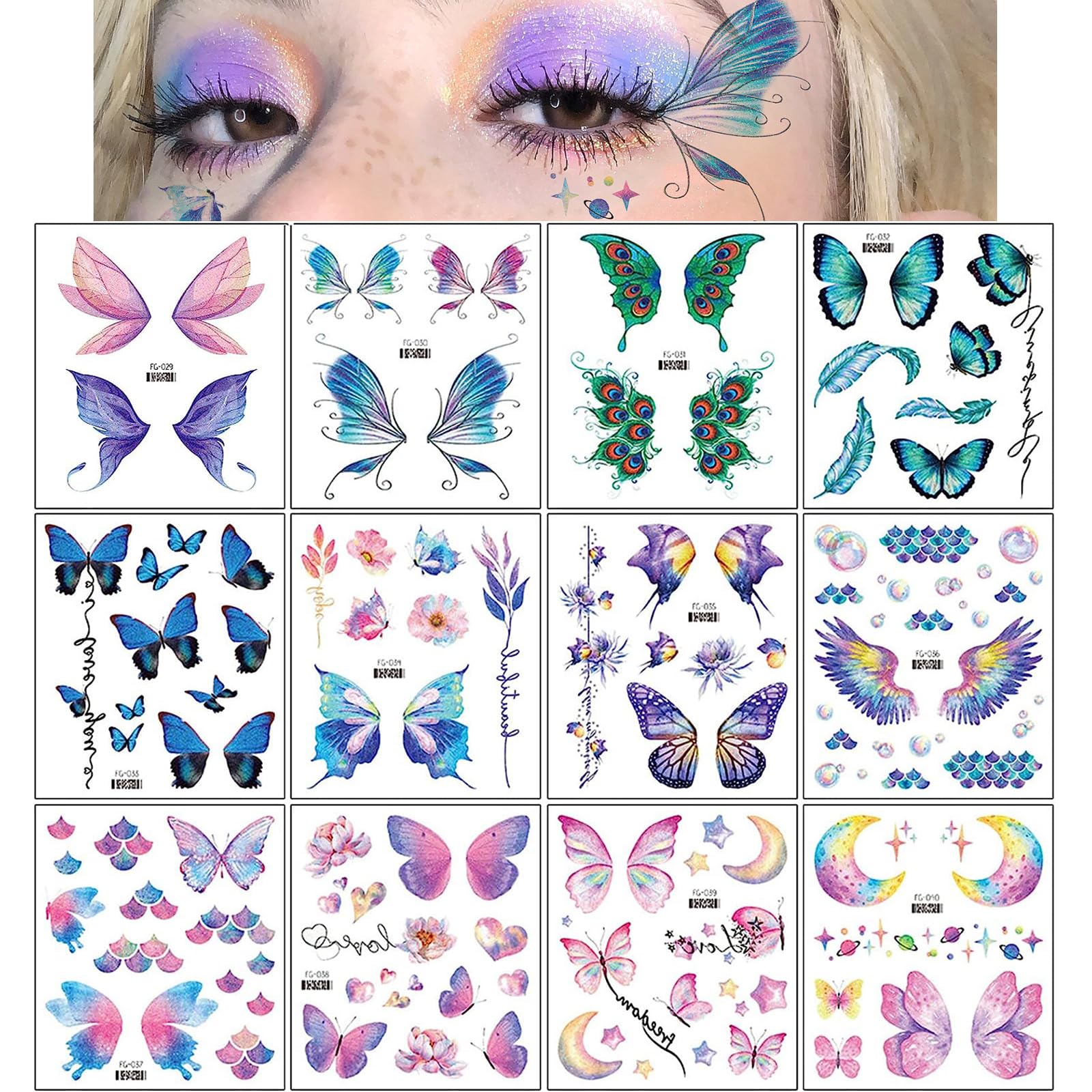 konsait12 sheets of f Glitter Butterfly Temporary Tattoos for Women Girls in different shapes and patterns designed to immerse your eyes make up and other face sticker ideals!