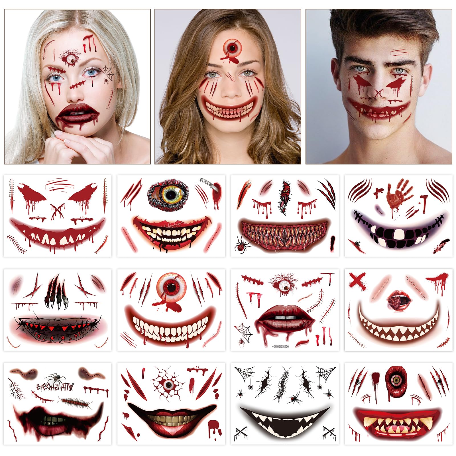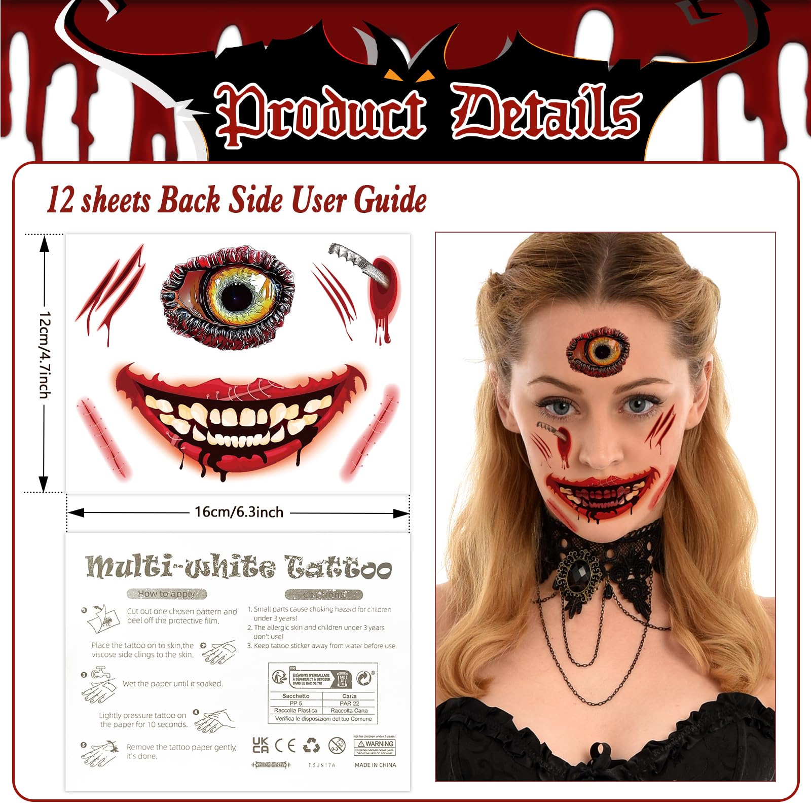 Package Content: 12 sheets Halloween face tattoos