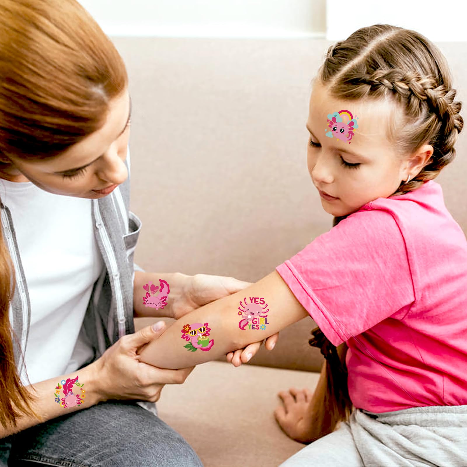 Those axolotl temporary tattoos can be stick on the waist, chest, neck, arms, back, etc. For better use, please do not covering it on the wound or use broken tattoos, and keep the skin clean before use.
