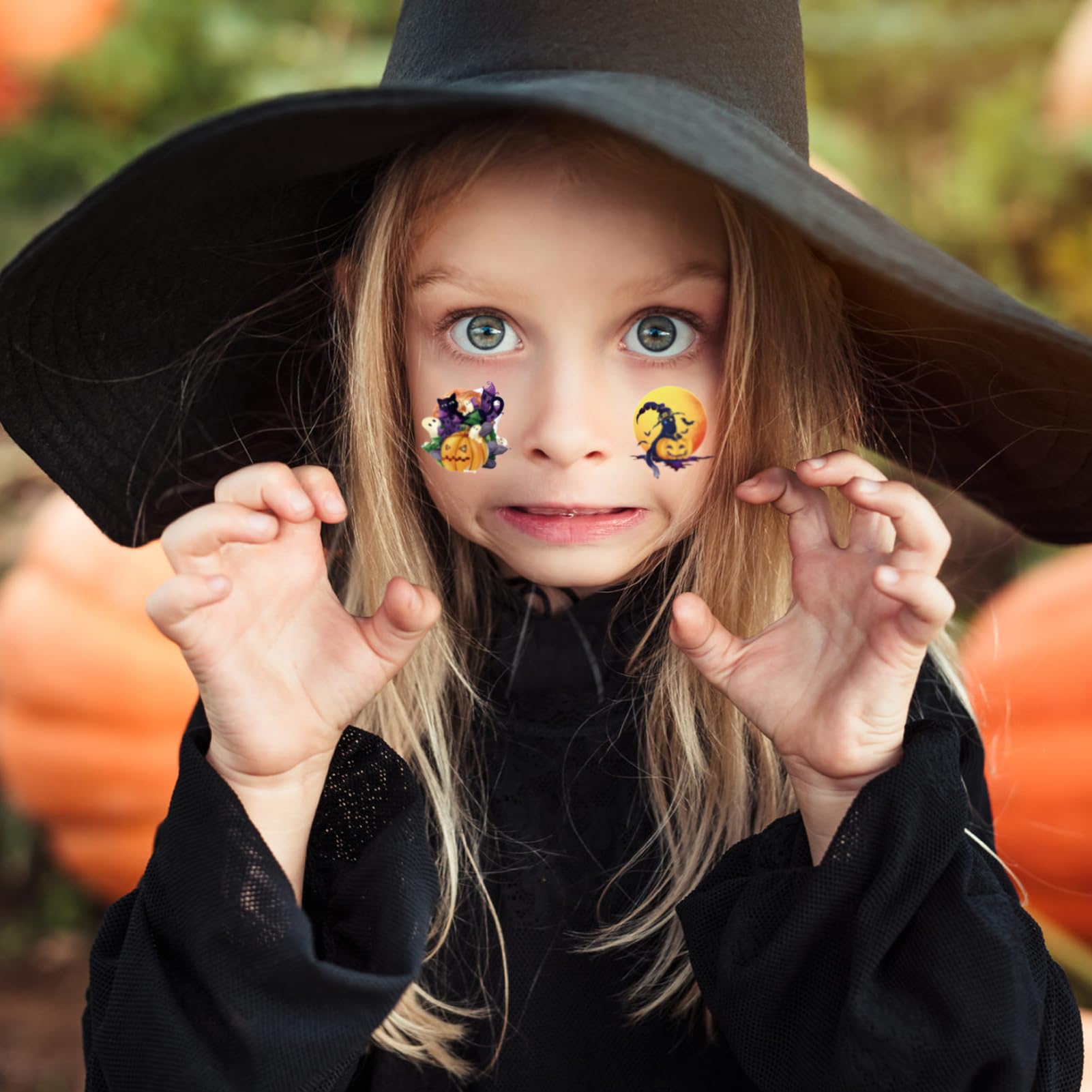 The design of tattoo stickers is perfect for the Halloween theme. Among the essential elements include black cats, pumpkins, magic hats, ghosts, alchemy pots, bats, castles and witches.