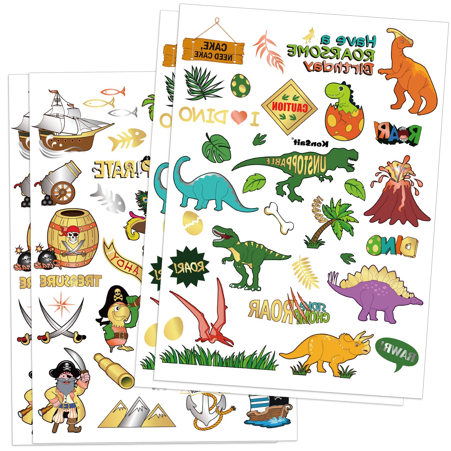 Konsait Dinosaur Pirate Temporary Tattoo for Kids, Dinosaur Pirate Birthday Party Favors Supplies, Face Arm Hands Back T-rex Decorations for Boys Stockings Stuffers Goody Filler Rewards,132 Design