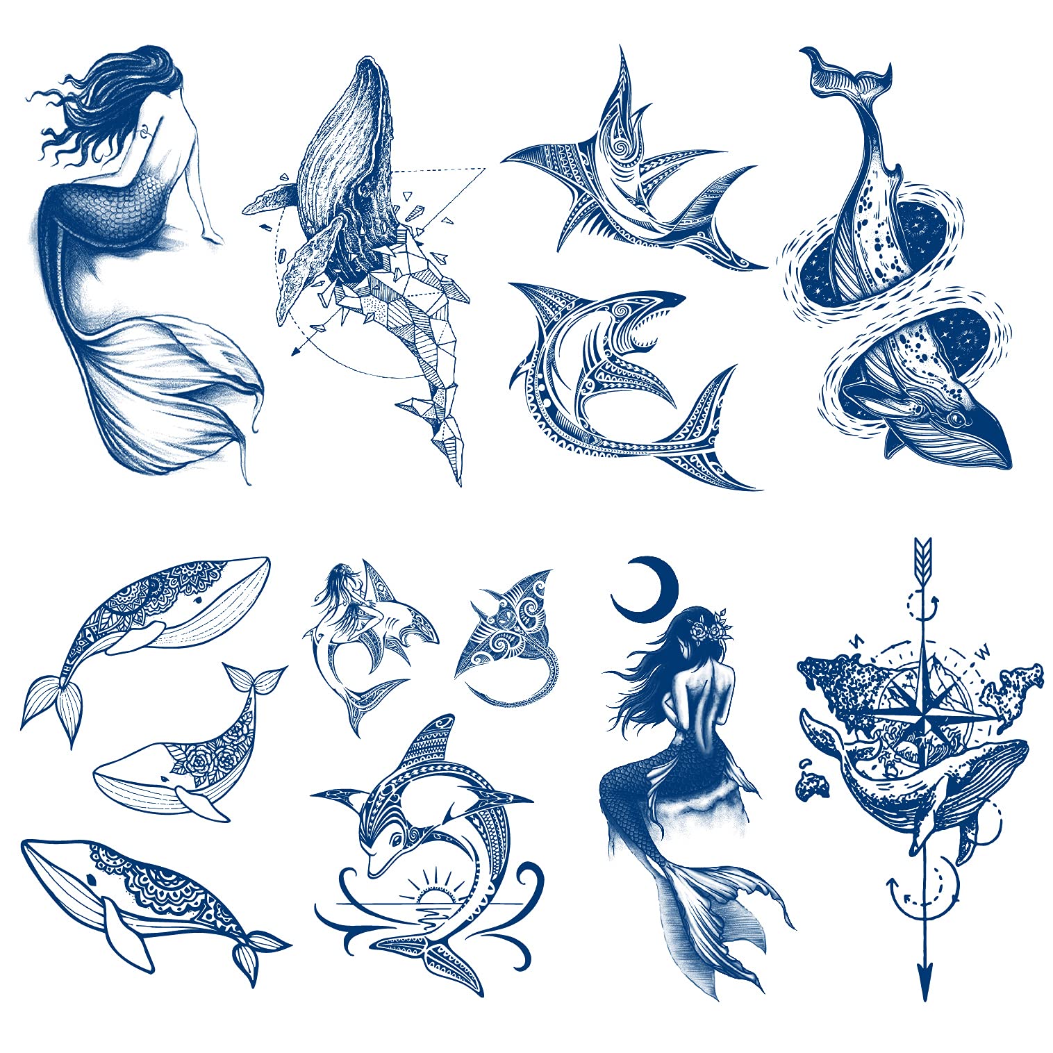 Kotbs 8 Sheets Semi Permanent Mermaid Whale Shark Tattoos, 100% Plant-Based Ink Infinity Premium Fake Tattoo Stickers, 1-2 Weeks Long Last Waterproof Tattoos for Adults Men Women Girls Kids