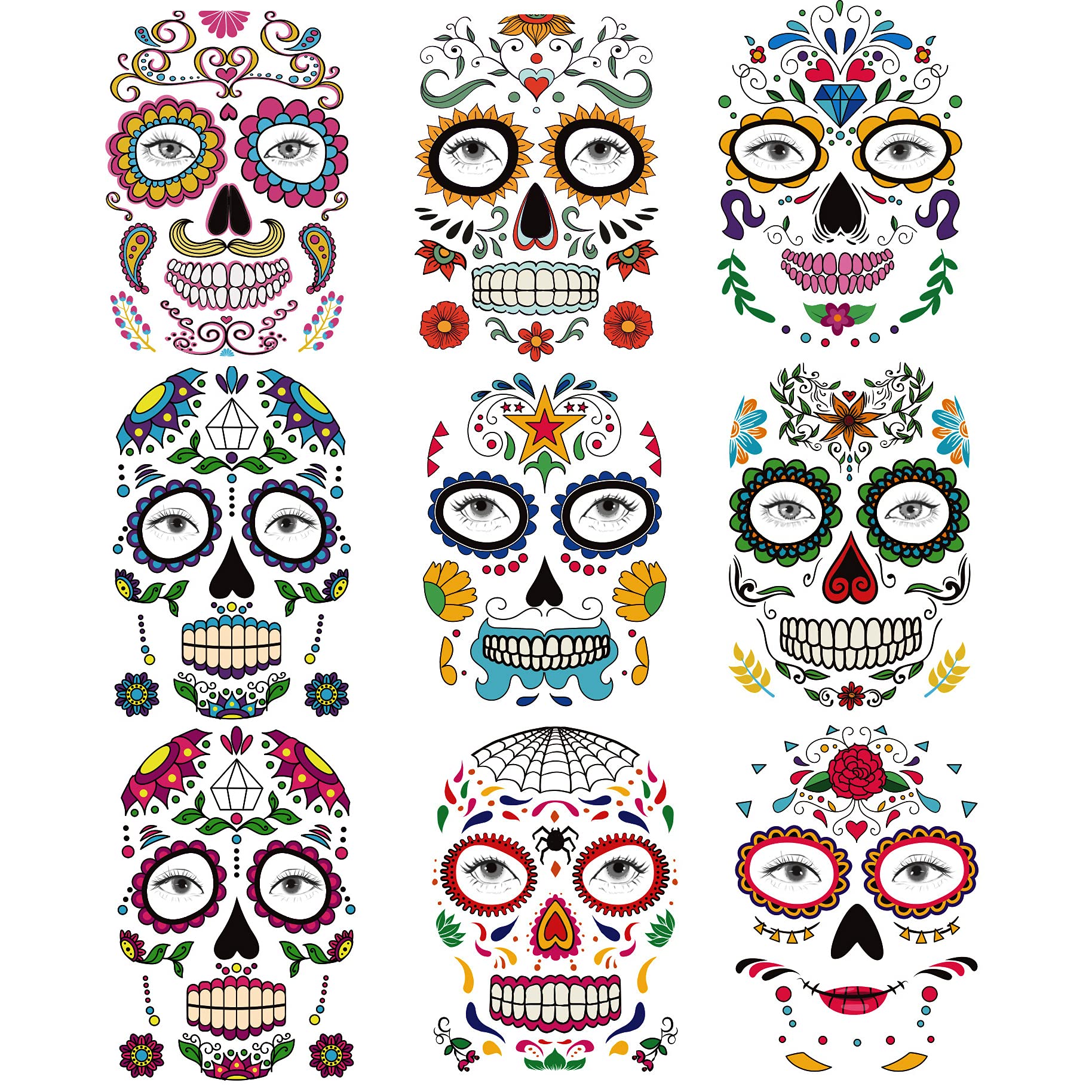 Kotbs 9 Sheets Day of the Died Skeleton Face Tattoo Stickers, Glitter Red Roses Temporary Tattoos for Men and Women - Halloween Costume Accessories and Party Favors