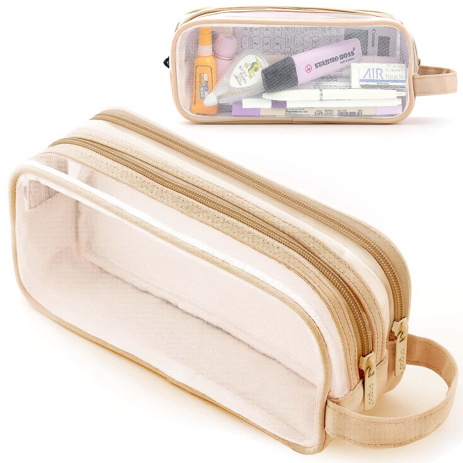 Large Grid Mesh Pencil Case 2 Compartments, Clear Pen Pencil Pouch with Zipper, Multifunction Transparent Stationery Bag for Student College Office Teen Boys Girls Makeup Bag for Adults (Light Coffee)