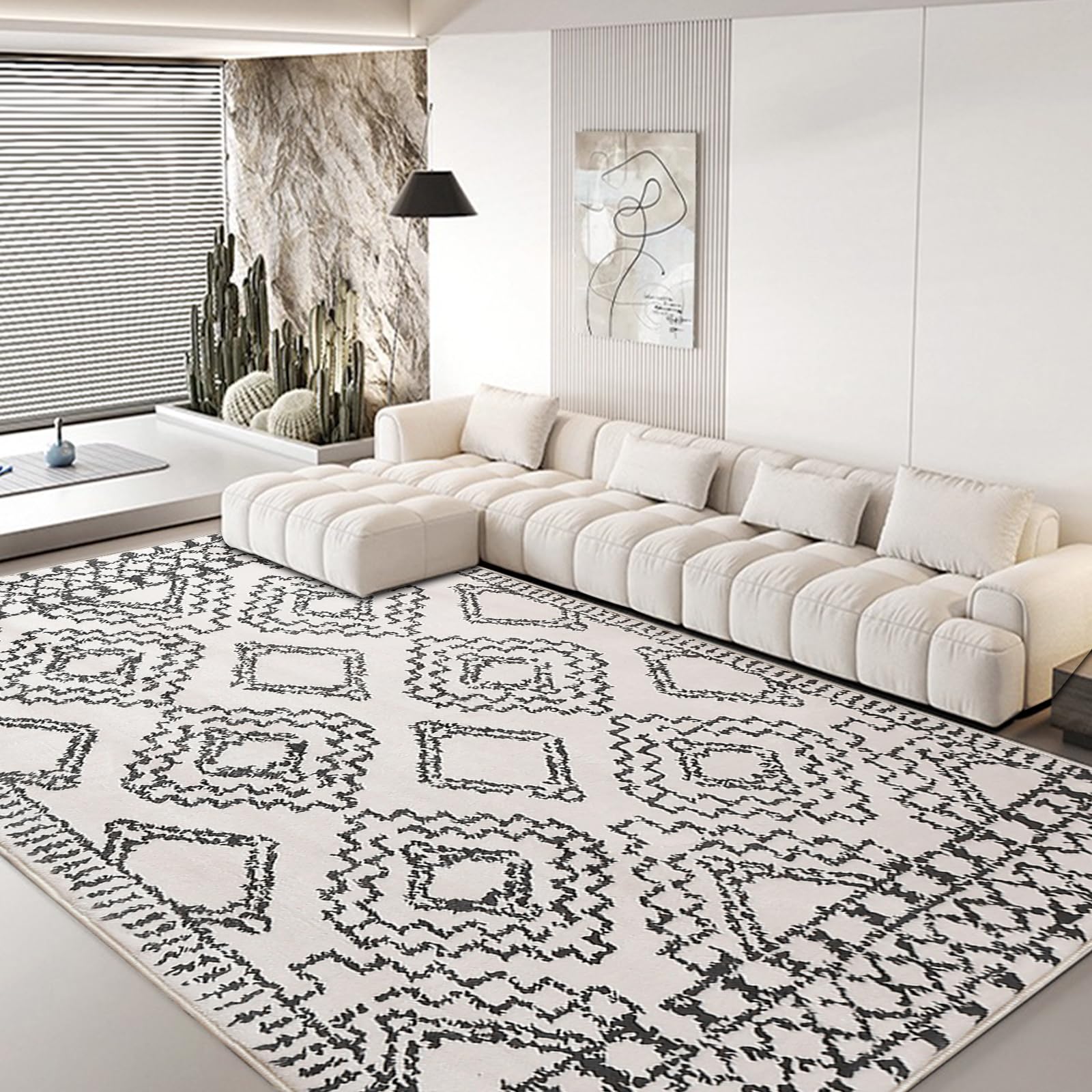 Leesentec Moroccan Area Rugs Living Room Rugs Modern Abstract Rug Geometric Carpet Non-slip Short Pile Rug Large Rugs for Living Room Soft Bedroom Area Rug (Ivory/Black, 200 * 250cm)