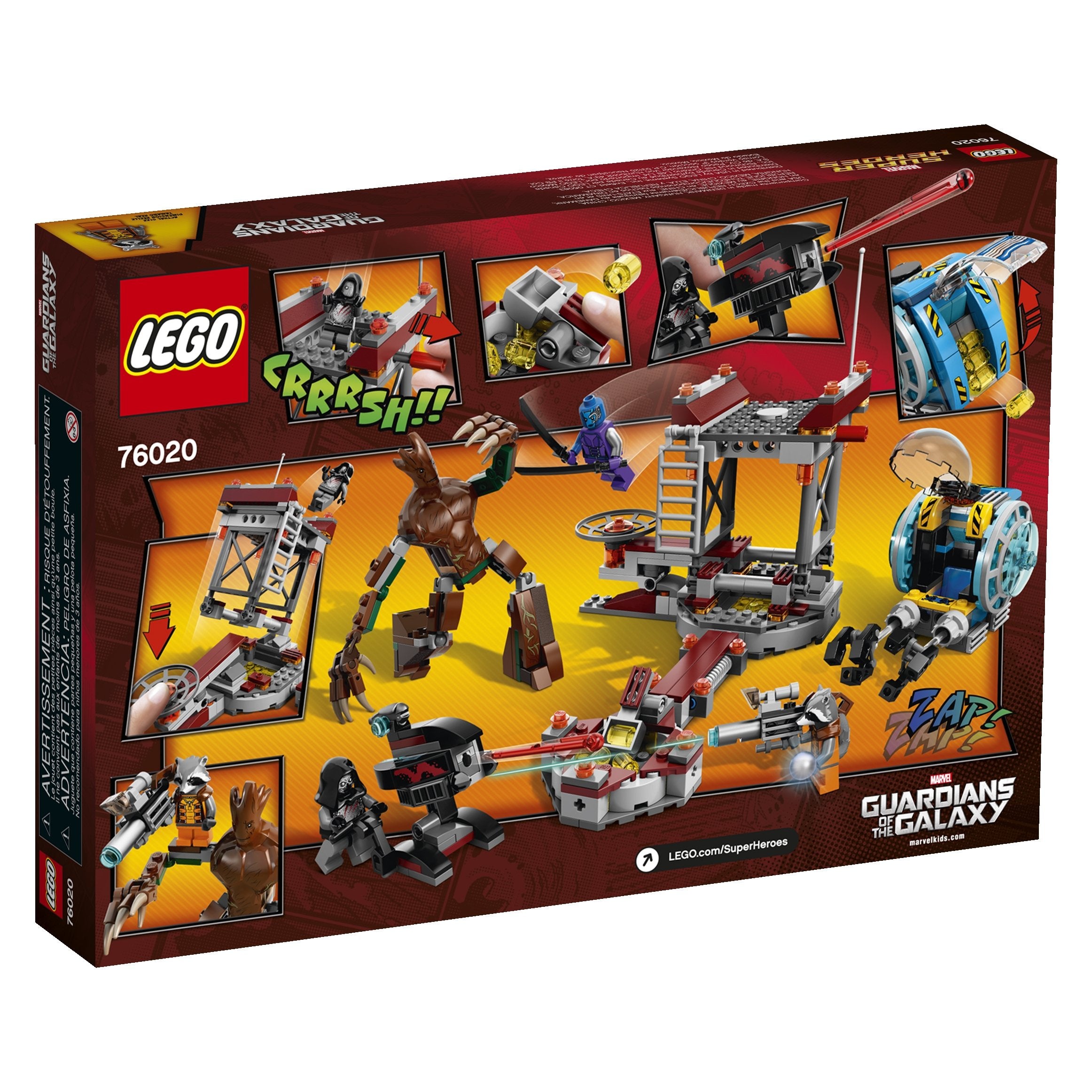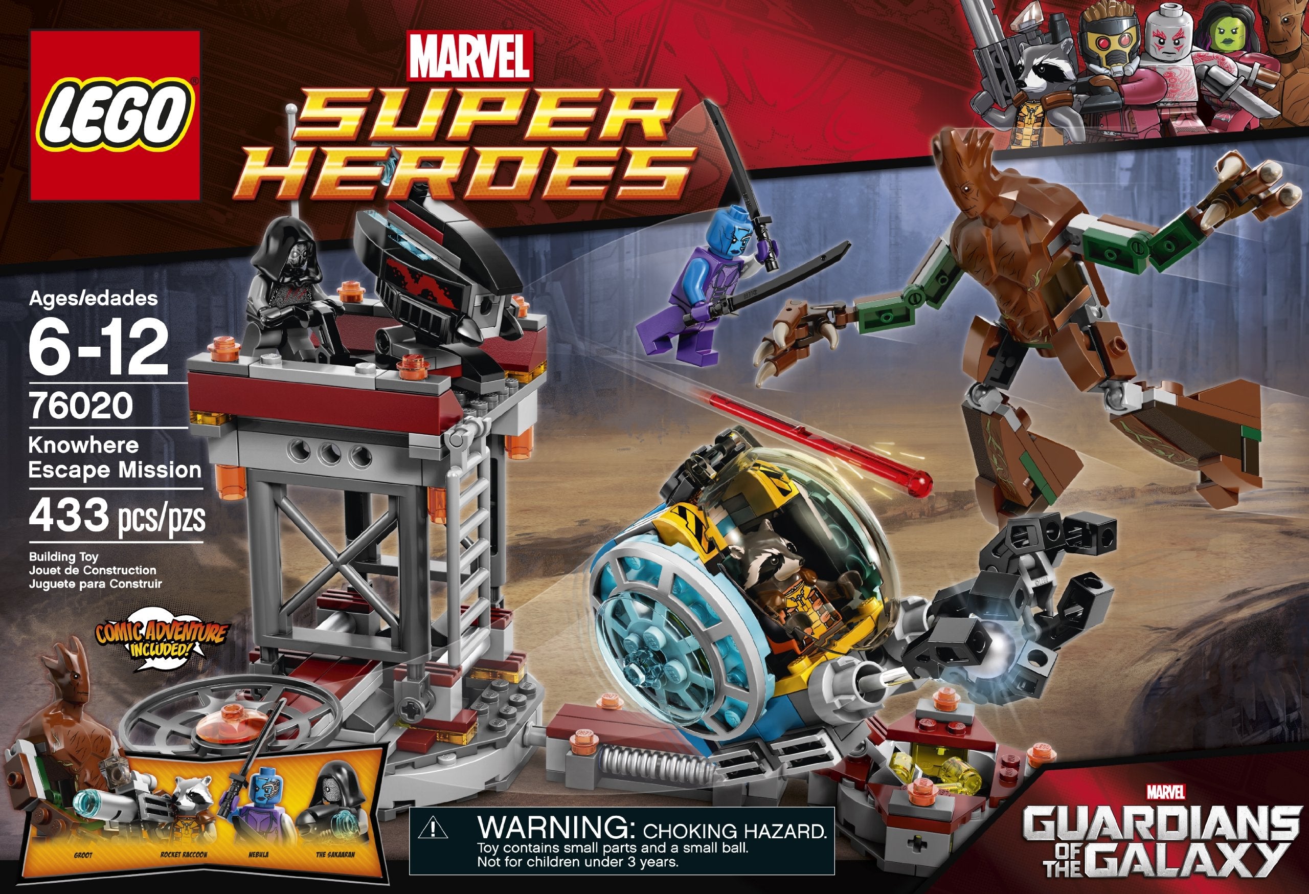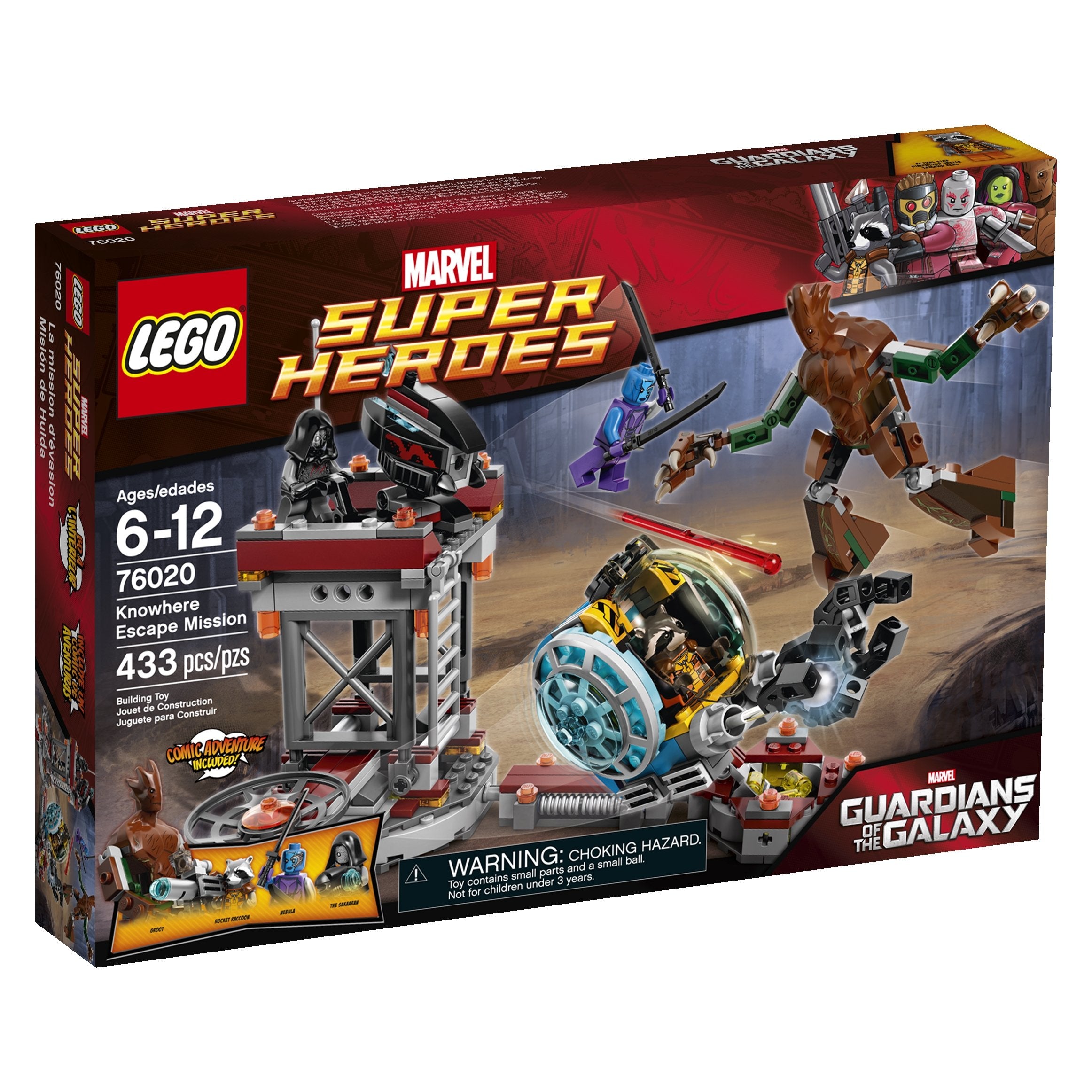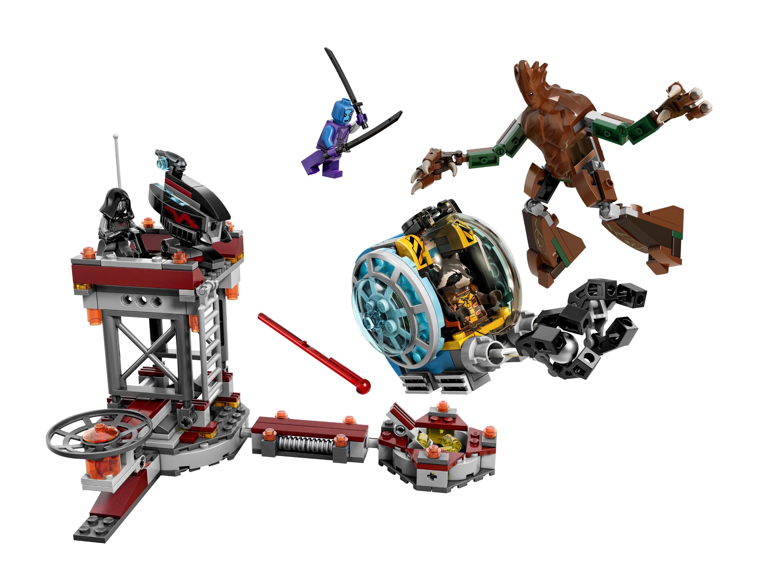 Team up with Groot and Rocket Raccoon to plot an escape from Knowhere! They've discovered the rare orb in the mining fields, only to be ambushed by the bad guys. Evade shots from the huge bazooka assembled by the Sakaaran and the evil Nebula and return fire with Rocket Raccoon's custom space blaster. Leap into action with the gigantic posable Groot to confront the sword-wielding Nebula. Launch a fierce counter-attack so Rocket Raccoon can get away in the mining pod with the precious orb in its grabbing claw! Includes 3 minifigures with assorted weapons: Rocket Raccoon, Nebula and the Sakaaran, plus Groot figure.