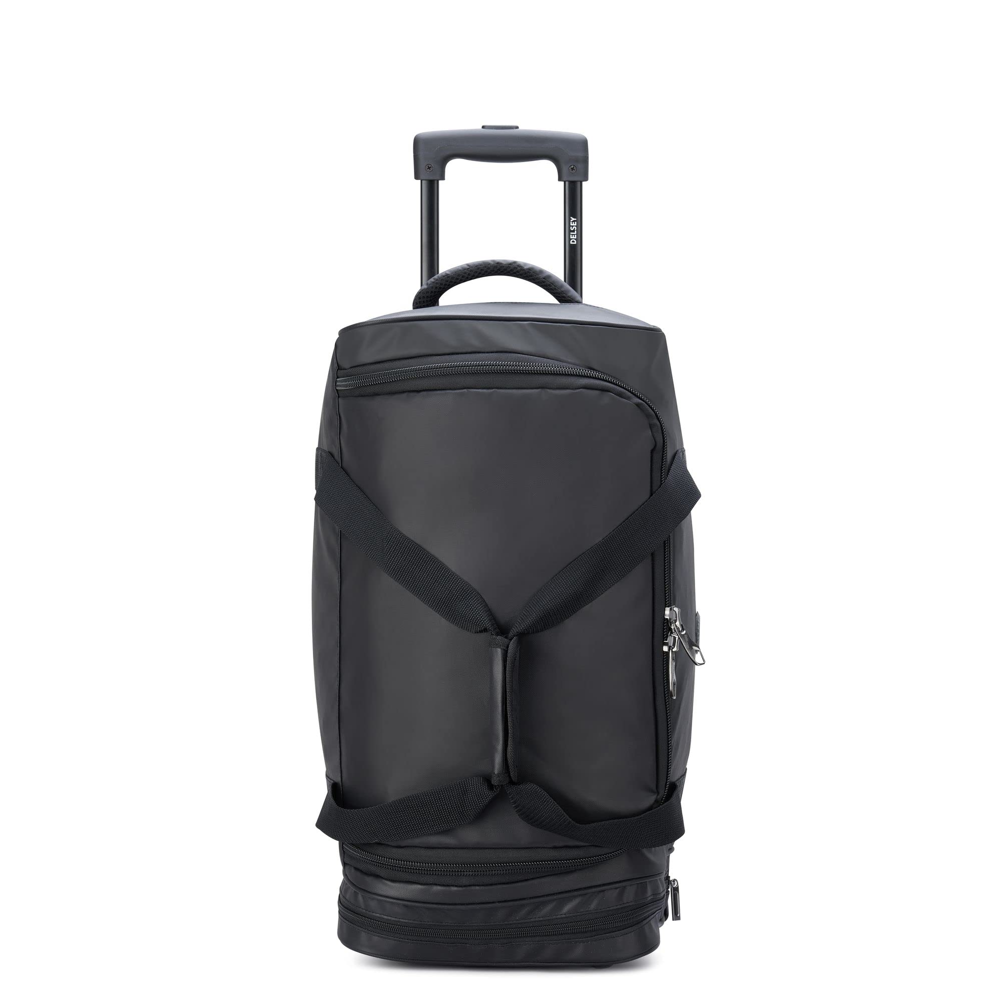 DescriptionDelsey trolley in practical format.Trolley details:Outer dimensions: width approx. 29 cm, height approx. 56 cm, depth approx. 27 cmDimensions inside: width approx. 29 cm, height approx. 54 cm, depth approx. 20 cmTelescopic trolley system adjustable: approx. 0 cm - approx. 40.5 cmWeight: approx. 2000 g.Volume: approx. 47 LColour: black.On the top, 1 reinforced carrying handle, breathable: approx. 18 cm2 handles can be fixed: approx. 65 cmMaterial: 100% polyester.Sustainable ingredients: recycled polyester.Box contents: Delsey trolley with label, 1 x lock.Trolley features:Trolley is closed with lockable two-way zip.In the main compartment, 1 mesh zip compartment.On the underside, 1 zip compartment with two way zip.Equipped with protective feet and replaceable flapEquipped with quiet wheels and extra access to the main compartment.Offers spacious main compartment.Can be converted into a bag.The Delsey logo is clearly visible.DELSEY Raspail 2R Trolley Travelbag 57 - The great trolley with practical carrying options.Are you looking for a stylish travel companion? Then the Delsey trolley is just the thing for you. The trolley is equipped with quiet wheels, but can also be easily converted into a travel bag thanks to the numerous carrying handles. Thanks to the spacious main compartment, you can store a lot in the DELSEY Raspail 2R trolley travel bag 57 and therefore have everything you need with you.