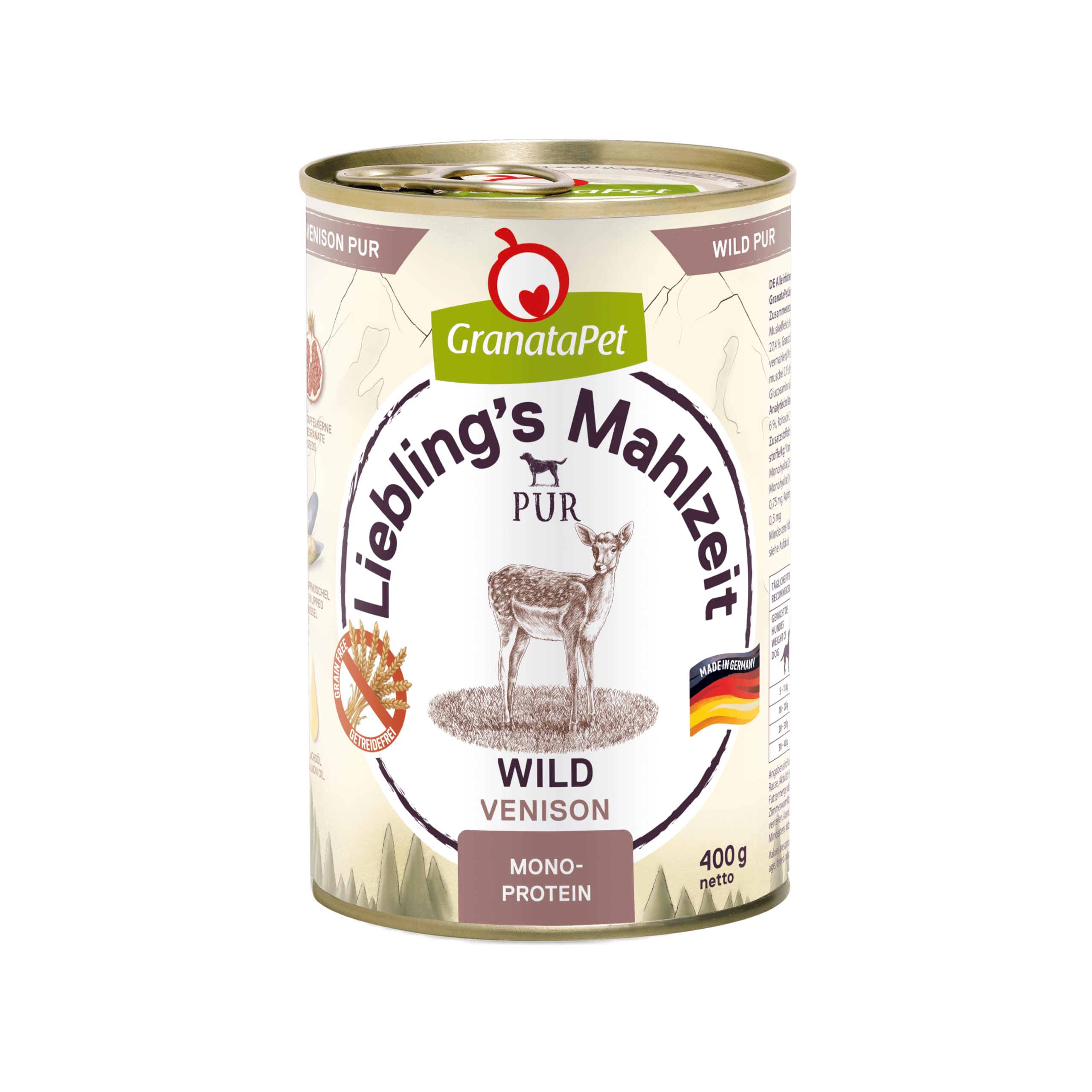 Gran Atapet favourite's meal Wild PurGran Atapet favourite's meal Wild is a classy, tasty meat container (Single animal protein) without grains or cereals for meat lover. The pomegranate seeds to serve the cell protection and strengthens the immune system. Additionally contains meal Salmon Oil with valuable fatty acids and the Green-Lipped Mussel, which naturally rich in the Gelenkaktiven ingredients Glucosamine & Chondroitin.A classic and tasty offers pure this favourite's meal a special experience for the taste buds.What do gran Atapet therefore very? The high-quality Pomegranate Seeds Ideal as a gift for your dogs to get a most unique aromas and flavour experience. They are exceptionally rich Polyphenolen (particularly Ella Gsäure) resistant by nature. Thanks to the targeted catch free radicals, this may for positive cell protection as well as strengthen your dog's immune system.Made: in Germany with Pomegranate cores with salmon oil with Green-Lipped Mussel with natural vitamins, minerals and bioactive substances without grains or cereals, no gluten no wheat, no rice, no corn, no soy no need to add sugar, no vitamin K3 Contains no artificial preservatives and colour and perfumes No ingredients (no genetically modified organisms) not tested on animalsComplete food for all adult dogsComposition: Venison 70% (from muscle meat from, wild heart, Wildleber, wild, lung, Wildpansen), meat broth, Pomegranate cores 1% (dried, and fine Vermahlen), minerals, salmon oil 0.5%, green-lipped mussel (0.1%, fine Vermahlen, naturally rich in glucosamine & chondroitin).Analy tables components: Protein: 9.90%, Fat content: 6,80%, Rohasche: 2.4%, Fibre: 0.40% Moisture content: 75%, Calcium: 0.22%, Phosphorus: 0.17%Diet, physiological additives/kg: Vitamin D3: 200 IU, Vitamin E: 30 mg, Biotin (as a D (+) - Biotin): 300 mcg, Zinc (as zinc sulphate, monohydrate): 15 mg, Manganese (as Manganese (II) sulphate, monohydrate): 3 mg, Iodine (as calcium Iodine water-free): 0.75 mg, Selenium (as sodium lenit): mg