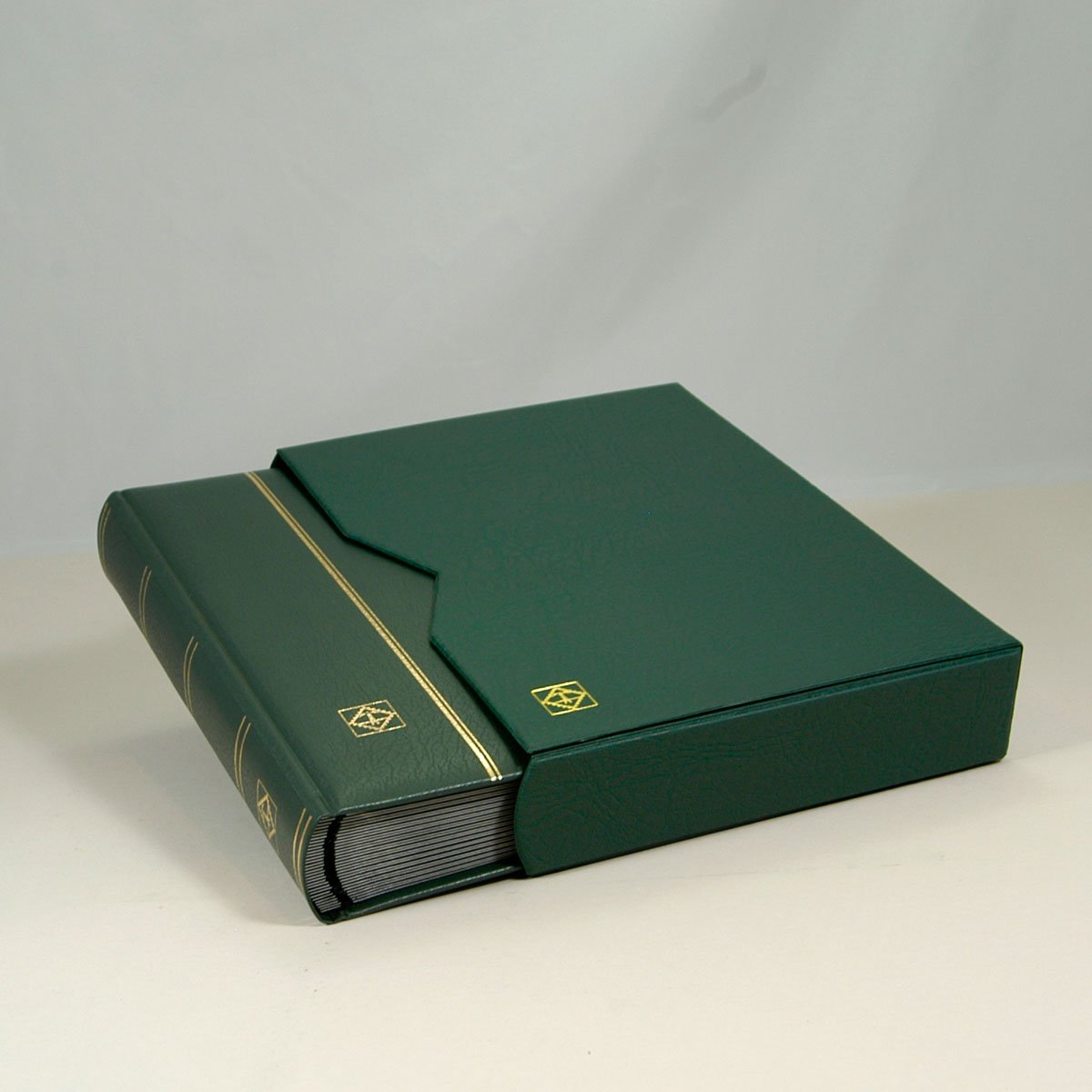 This stockbook is green padded genuine leather with gold lettering and features a double linen hinge binding. It comes in a leather slipcase. The exterior measures 9" x 12" (230 x 305mm).