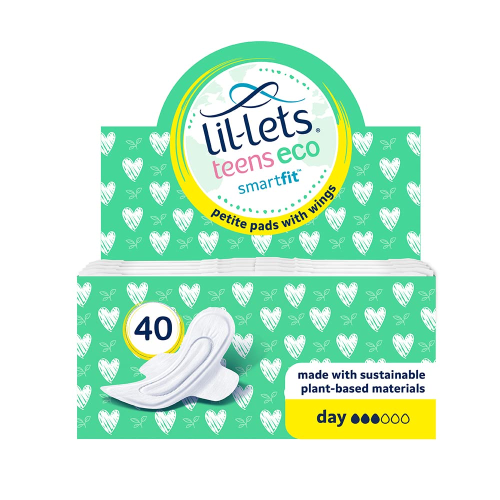 Lil-Lets teens eco, petite day pads with wings are made with bamboo and other sustainable plant based materials. They come in a fold out cardboard tray which contains 40 pads. Our teens eco pads are designed to be smaller and narrower, so are perfect for younger girls (or petite women). The super soft top cover is made from bamboo, which is brillianty breathable and kind to your skin; they are free from fragrance, dyes, chlorine bleach, vegan and ethically sourced. Each pad is individually wrapped in a biodegradable and compostable wrapper, helping you to have a more planet friendly period* For more information about our products please visit our website.