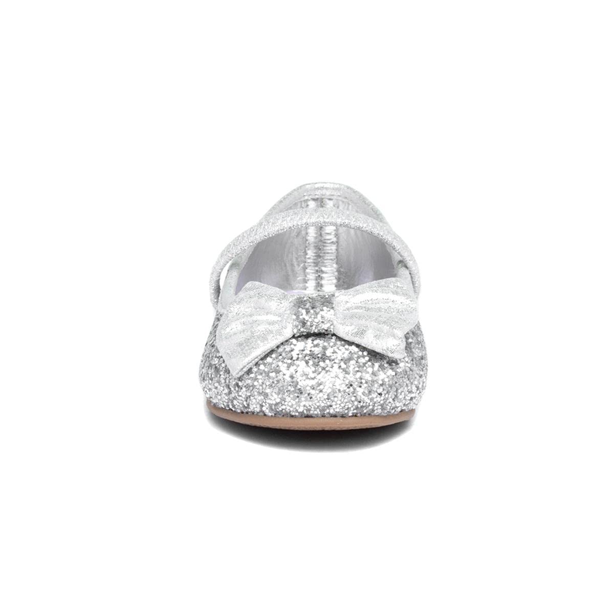 It wouldn't be a party without these girls' ballerinas from Lilley Sparkle. Featuring a silver glitter upper with bow detailing and silver trim, these ballerinas are easy to fit thanks to their slip on fitting. Their elastic strap brings security, while their insole brings comfort. Additionally, their gripped outsole brings stability. For up to 1 years old we would recommend infant size 3-4, 2 year olds a size 5-6, 3 year olds a size 7-8, 4 year olds a size 9-10, 5 year olds a size 10-11, 6 year olds a size 11-12, 7 year olds a size 12-13, 8 or 9 year olds a size 1-2 and 10-11 year olds a junior size 3-4.