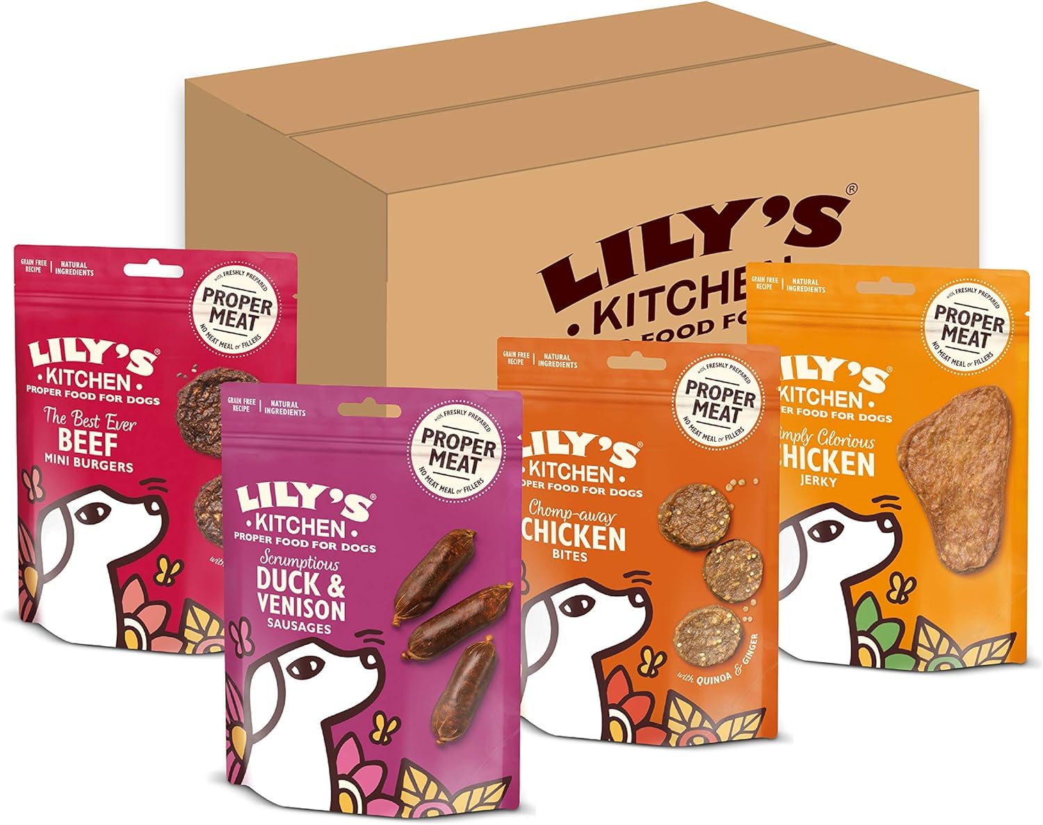 Product DescriptionTreat your dog with Lily's Kitchen new range of chews and bites, made with proper meat and 100% natural ingredients. When Lily the border terrier became ill with itchy skin, it was homemade, natural food that made her better. Now Lily's Kitchen creates proper food for pets, full of healthy, nourishing and quality ingredients. It's why our recipes use real meat, offal and veg and it's why you can see and smell the difference when you serve it up.IngredientsDuck 80%, Pea Protein, Vegetable Glycerine (derived from rapeseed oil), Distilled White Vinegar. Additives: Technological Additives: Antioxidants (Tocopherol extracts from vegetable oils (Sunflower Oil, Rosemary Extract, Lecithin)), Duck 70%, Pea Protein, Vegetable Glycerine (derived from rapeseed oil), Venison 4%. Additives: Technological Additives: Antioxidants (Tocopherol extracts from vegetable oils (Sunflower Oil, Rosemary Extract, Lecithin)), Freshly Prepared Chicken 80%, Pea Protein, Vegetable Glycerine (derived from rapeseed oil). Additives: Technological Additives: Antioxidants (Tocopherol extracts from vegetable oils (Sunflower Oil, Rosemary Extract, Lecithin)), Chicken 80%, Vegetable Glycerine (derived from rapeseed oil), Pea Protein, Quinoa 2%, Ginger 0.5%. Additives: Technological Additives: Antioxidants (Tocopherol extracts from vegetable oils (Sunflower Oil, Rosemary Extract, Lecithin)), Beef 80%, Vegetable Glycerine (derived from rapeseed oil), Pea Protein, Distilled White Vinegar, Chia 2%, Guar Gum, Kale 0.1%. Additives: Technological Additives: Antioxidants (Tocopherol extracts from vegetable oils (Sunflower Oil, Rosemary Extract, Lecithin))Box ContainsDog Treats MPK 8x70gManufacturer Contact InformationPO Box 59287, London, NW3 9JR