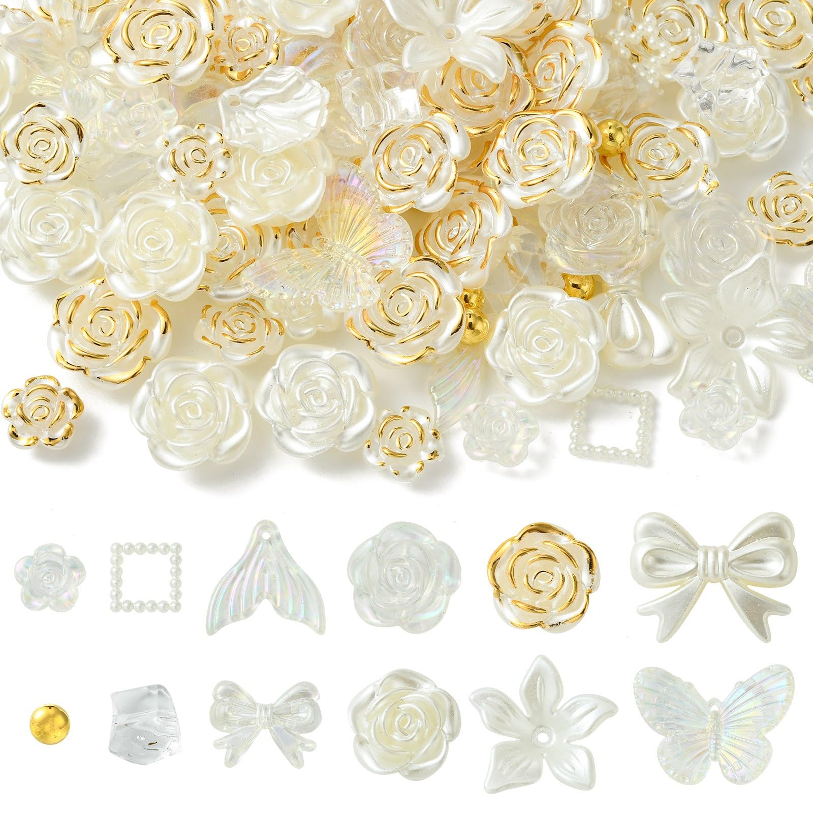 LiQunSweet 100 Pcs Vintage Baroque Style Acrylic Beads Charms Rose Flower Bowknot White Beads for Bracelet Jewelry Making Earrings Necklace Keychain Making DIY Crafting