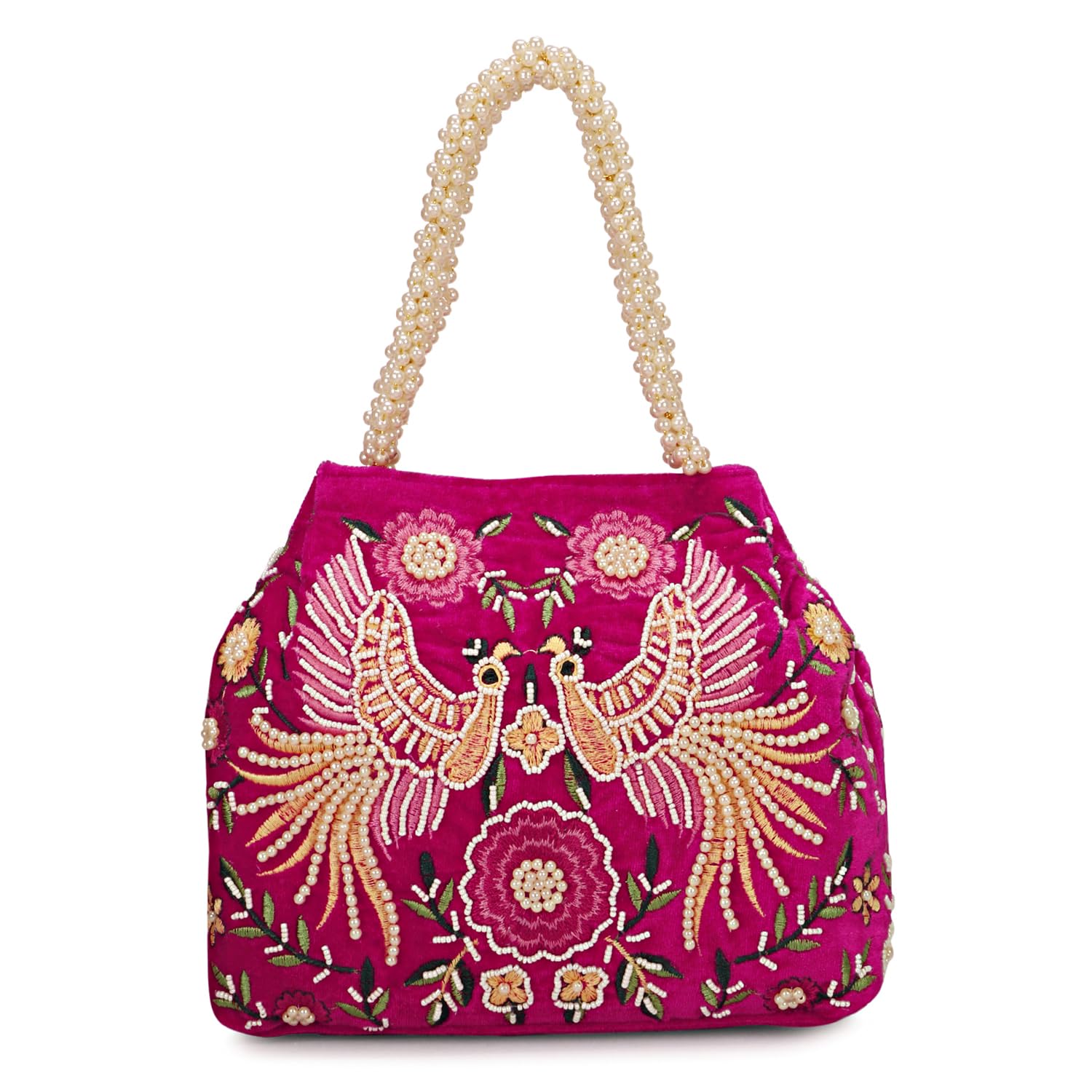 LONGING TO BUY brings new designs and a very huge collection of potli bags. Potli bag is a ethnic stylish clutch,kind of Indian handbag and potli bag looks very nice with any traditional dress and also goes well with any casual Indian dresses. Suman Enterprises Potli bag are designed for any evening or casual occasions at any time of the day. Velvet embroidered polti with antique peacock design and bead handwork and stylish small pearl handle is provided for easy carrying. The potli comes with 3 megatic closures. A very beautiful traditional piece that adds charm to your attire and hence a must buy product for any women.